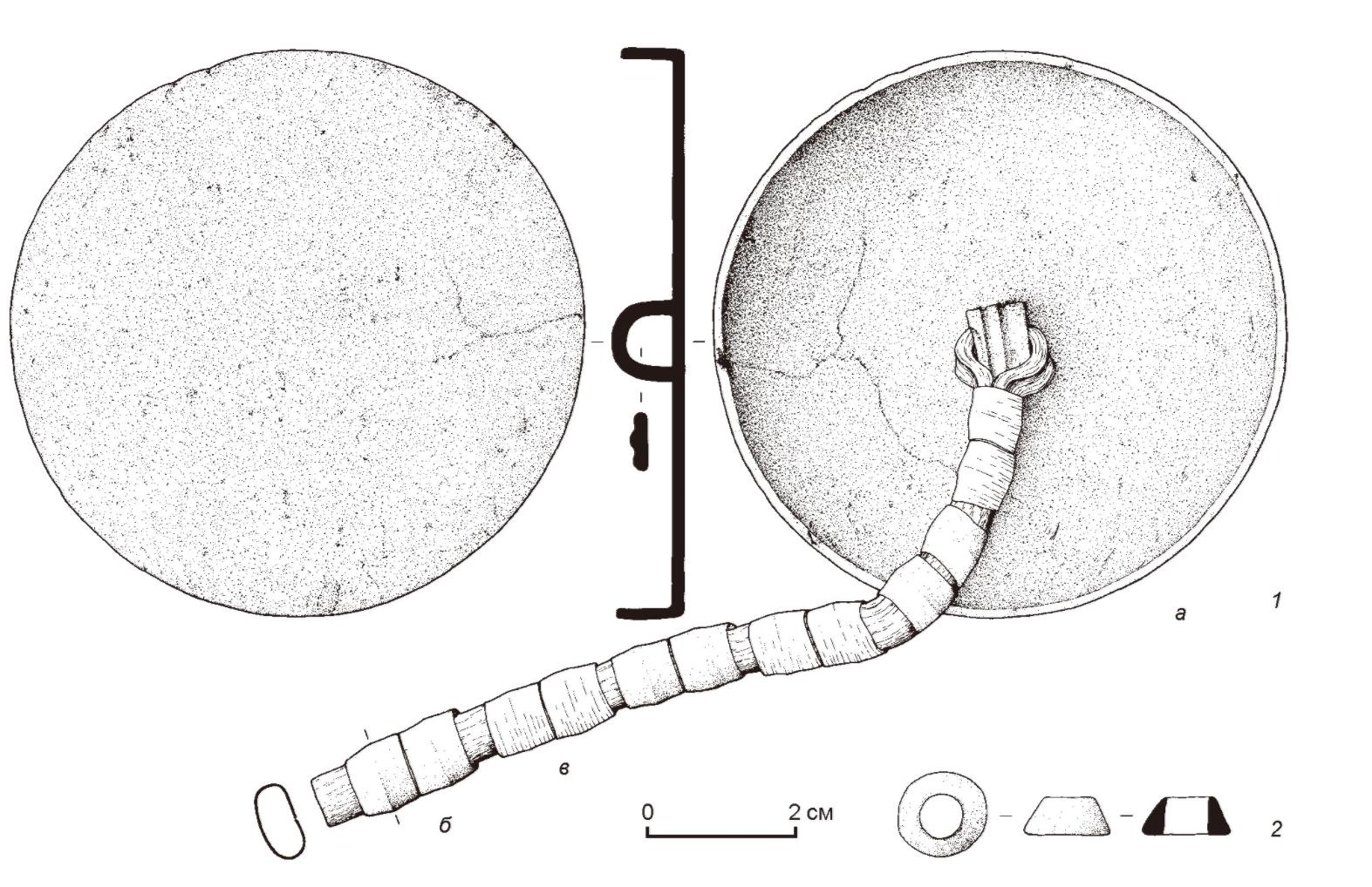 그림 4. 아르잔-2호 무덤방 5호 출토, 여성의 거울(그림 3과 동일유물)과 부속품, 뒷면에 달린 꼭지에 가죽끈이 달린 모양이 잘 이해된다.