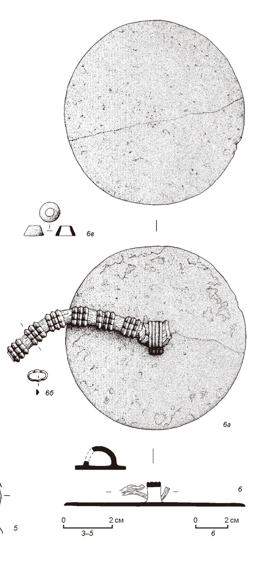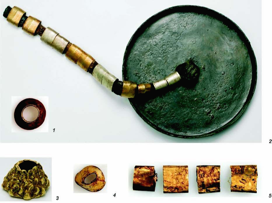 그림 1. 아르잔-2호 무덤방 5호 출토, 남성의 거울과 그 부속품, 꼭지가 달린 부분은 거울의 뒷면이다. 거울의 앞면은 장식이 없다. 4,5는 거울과 관련없다.