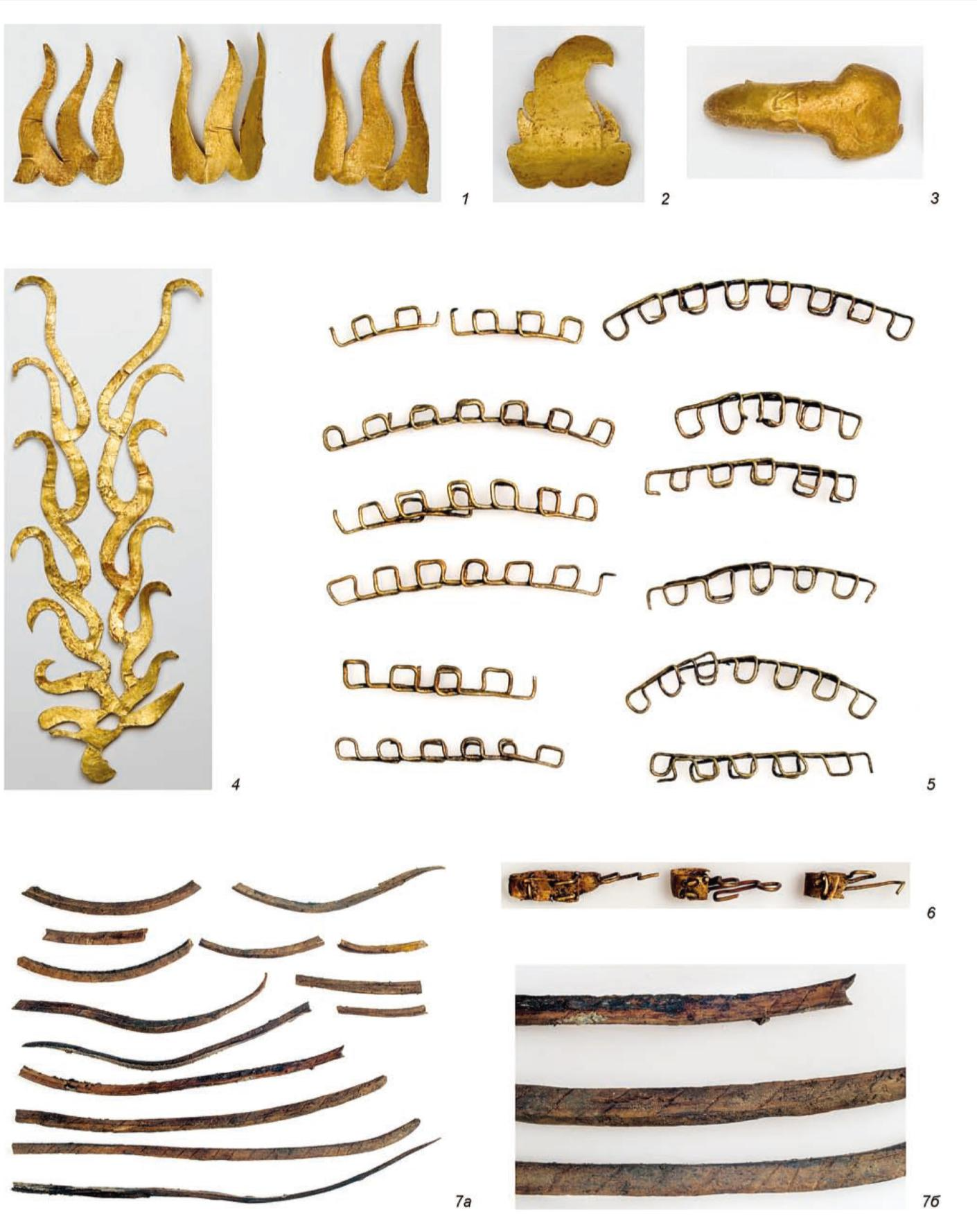 그림 7. 아르잔-2호 무덤방 5호 출토, 활(7)과 부속품, 1~4: 활대에 붙은 금박, 5,6:용도미상, 5는 40개, 6은 3개출토되었음, 그림 5에서 가장 우측에서 나란히 놓인 채로 확인되었다.