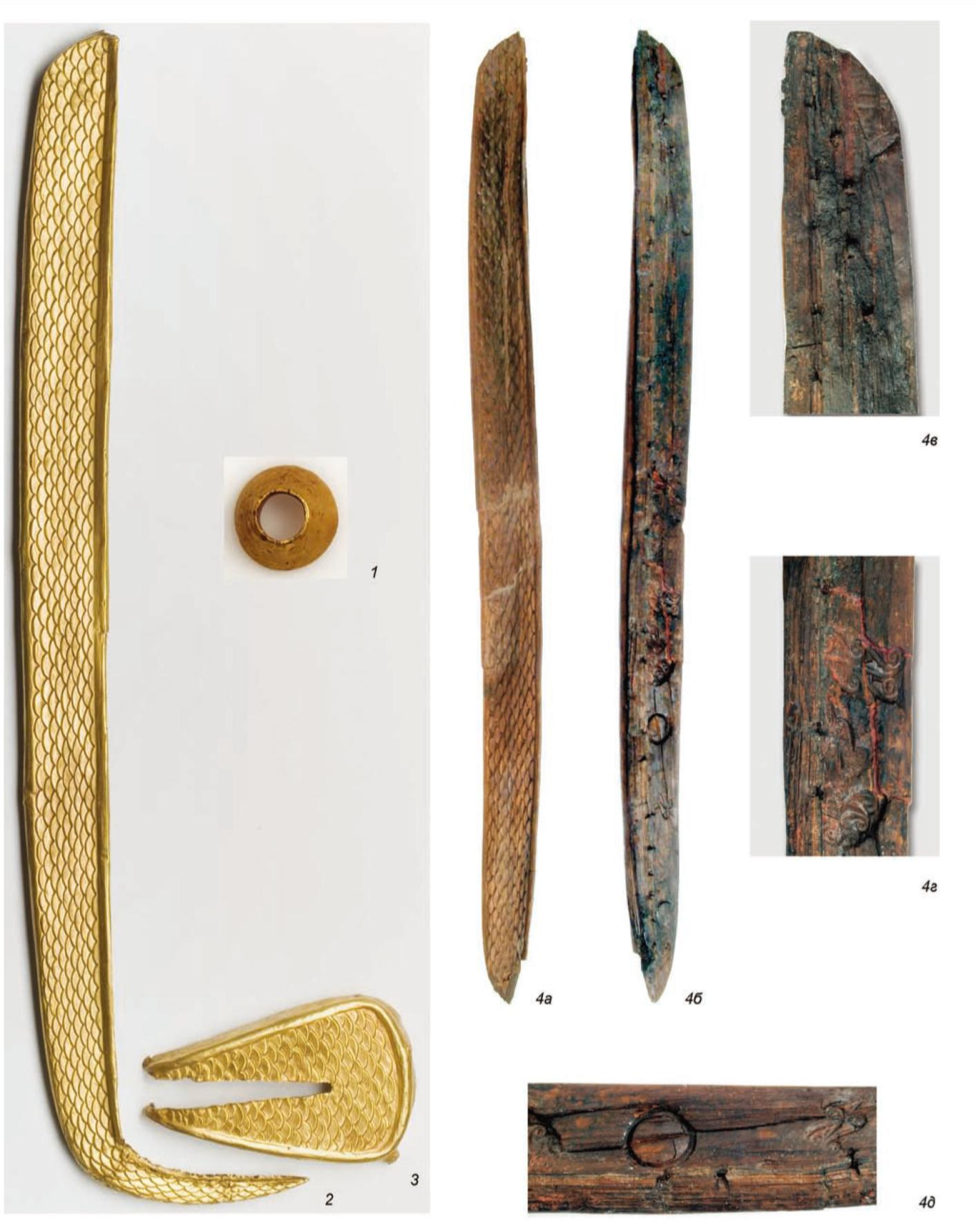 고리트(그림 3-4)는 나무와 가죽으로 만들어진 것인데, 가죽은 이미 썩어서 없어진 상태이다. 나무는 금박 혹은 금판(크기누락, 필자가 금판으로 부르는 이유는 아주 소형의 유물에 덮힌 금박보다는 두꺼울 것이기 때문이다)으로 덮였다(그림 3-1), 금으로 고리트의 바닥(그림 3-2)도 만들어졌다, 길이 50cm 나무뼈대에 새겨진 비늘 모양이 금판 위에 그대로 찍혔다. 나무 뼈대가 누르면서 금판의 비늘도 만들고, 고리트도 단단하게 했을 것이다. 나무 뼈대의 반대면은 매끄러운데, 고리트에 연결했던 장식판이 눌러진 흔적이 남아 있다. 나무판에는 24개의 구멍이 있어서 나무핀으로 금판과 연결된 흔적이 남아 있다. 금판은 고리트의 앞면에만 장식되었고, 금판의 한쪽 끝은 직각이 되게 하단부가 만들어지고, 따로 제작된 금판(그림 3-3)으로 연결될 수 있도록 만들어졌다.