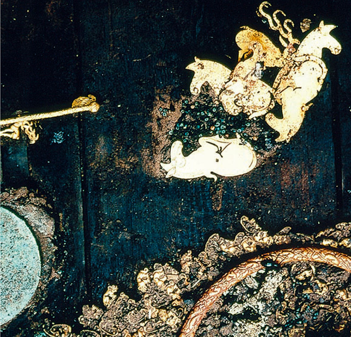 발견될 당시에 말보다 사슴은 머리 장식에서 가장 높은 곳에서 확인되었다(그림 3). 이는 의미가 있는데, 두 동물문양장식의 뒷판에 붙은 고리의 위치가 차이가 있는 점과 연결된다. 말 장식(그림 2-2)에는 너비 0.2cm 간격으로 16개의 고리가 2줄(그림 2-2)로 붙어 있는데, 단단히 고정시기키 위해서 만들어진 것이다. 사슴장식은 별도의 금판에 고리가 붙어 있었다. 이 부분은 두 동물의 자세가 다른 점과도 관련된다.