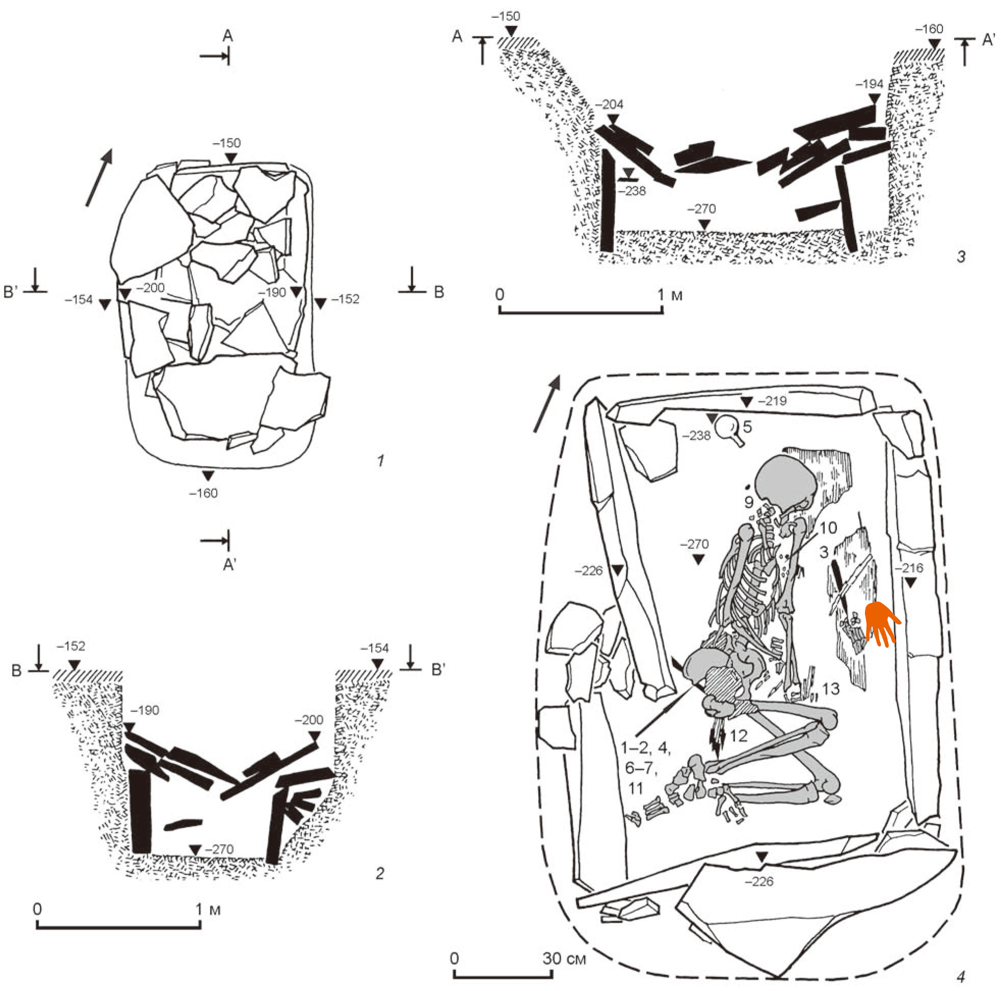 그런데 남성의 무기류는 대부분 좌측 골반뼈 부근에서 출토되었다. 하지만 . 화살 한 무더기는 팔 부근에서 출토되었고, 손잡이가 곧은 청동칼도 우측 손 부위에서 약간 떨어진 곳에 확인된 것이다. 그 옆에는 25호 남성이 아닌 다른 사람의 손뼈가 놓여 있었다(그림 4-4).