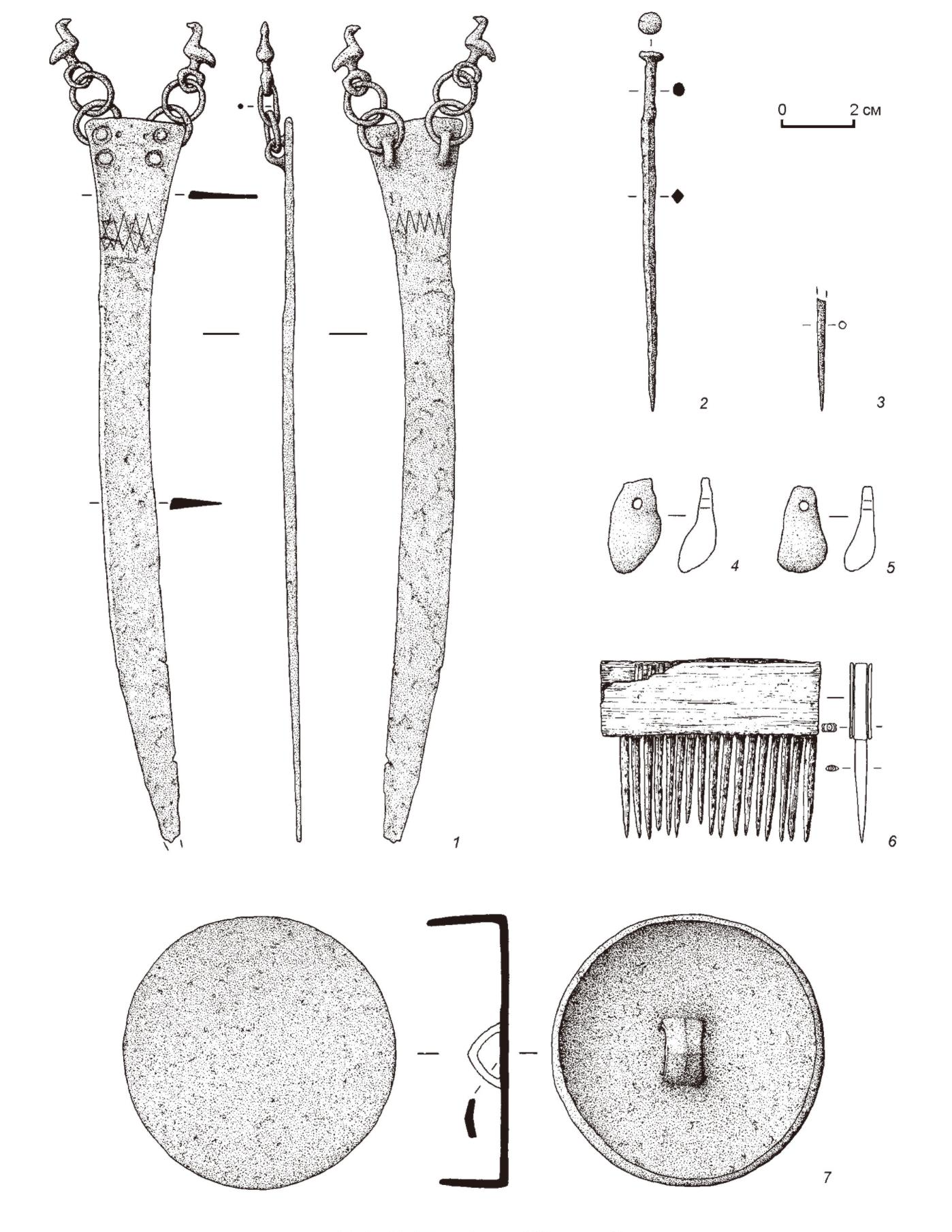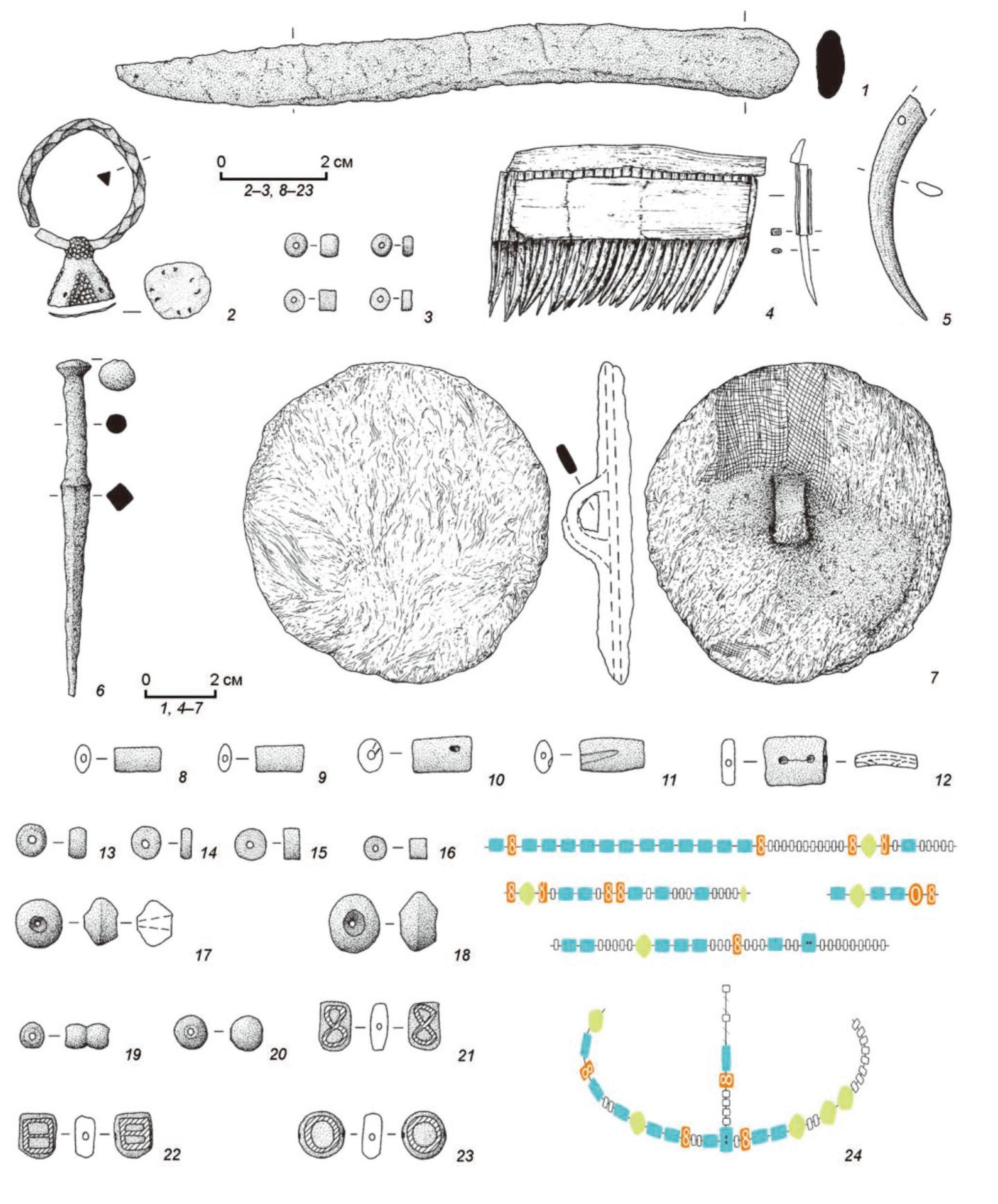 13A 무덤의 18세 여성은 청동칼(그림 3-1), 청동송곳(그림 3-4), 청동바늘(그림 3-3), 청동제 거울(그림 3-7), 화살촉(그림 3-2), 목제 빗(그림 3-6), 석제 펜던트(그림 3-5), 각 종 구슬(그림 3-8,9,15~19)과 함께 부장되었다.