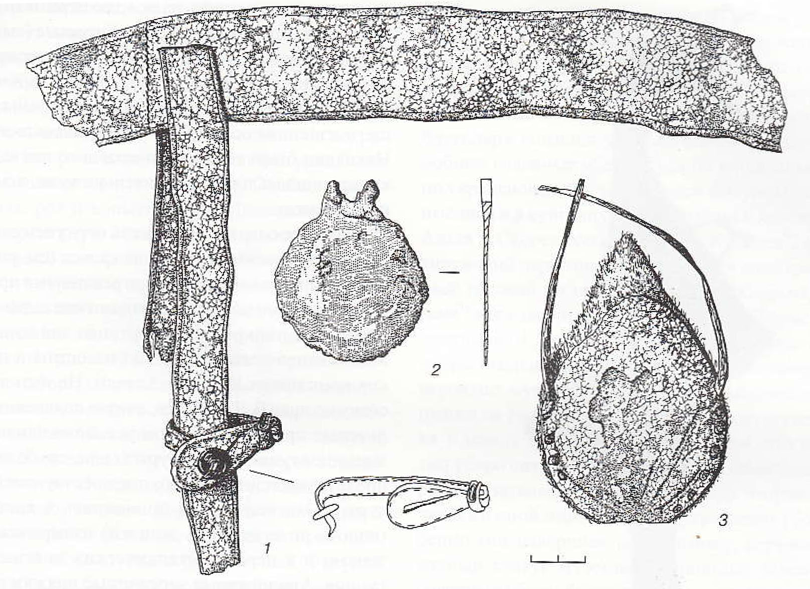 그림 1. 베르흐 칼쥔 II유적의 3호분 가죽벨트(1), 청동거울(2), 가죽주머니(3)