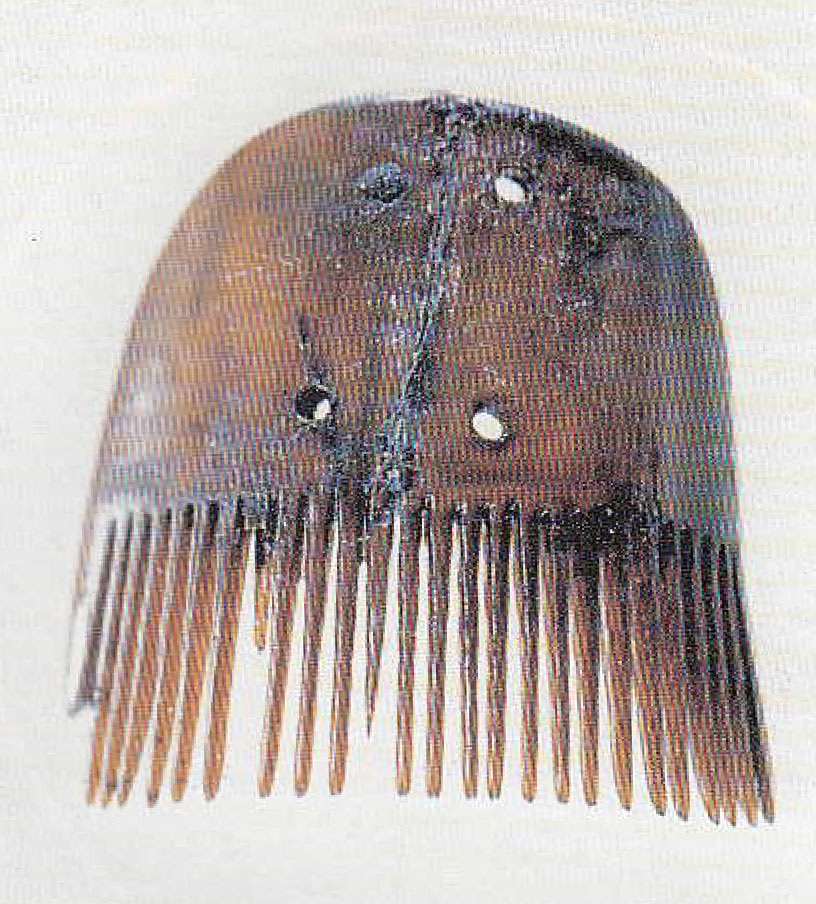 청동 거울 옆에는 뿔로 만들어진 빗(그림 4)이 확인되었다. 빗은 아르잔-2 유적에서도 출토되고, 이미 시베리아 청동기시대의 문화에서도 자주 출토되는 유물이다. 아마도 현재의 빗과는 다른 기능 혹은 다른 의미가 있었는지 모르겠다. 예를 들면 사냥도구의 일부였다던지....