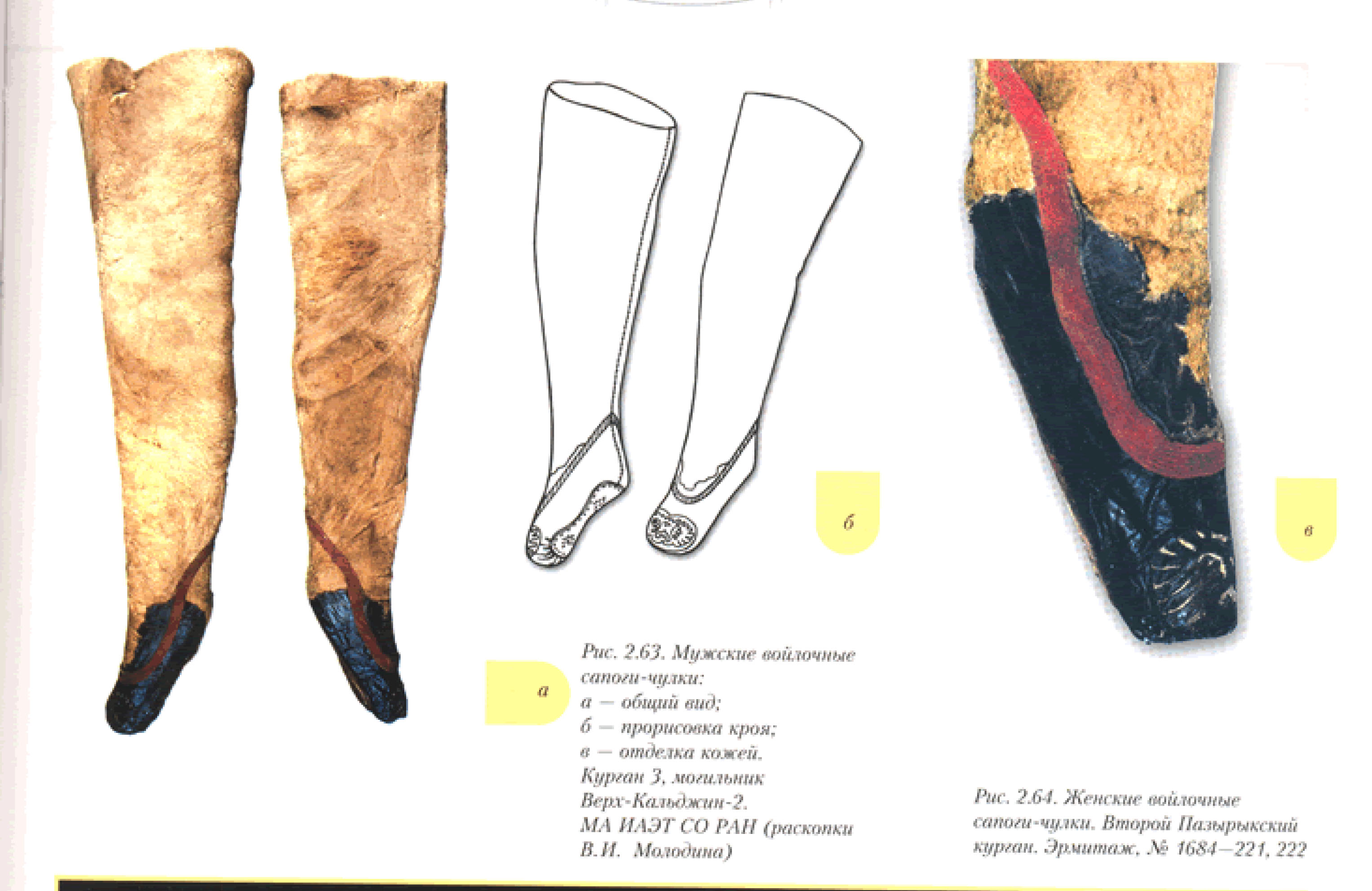 베르흐 칼쥔 II유적의 3호분 남성은 대신 발 부분에 양가죽(그림 3-3)을 덧댄 것이다. 스타킹형 부츠가 발견된 파지릭 유적의 2호분에는 전체 길이(발끝에서 허벅지끝까지)가 남아 있는 길이가 62cm(남성)(그림 5), 82cm(여성)(그림 6), 아크 알라하 3유적에서는 89cm(여성), 베르흐 칼쥔 II유적의 3호분(남성)(그림 3)에서는 99cm이다.