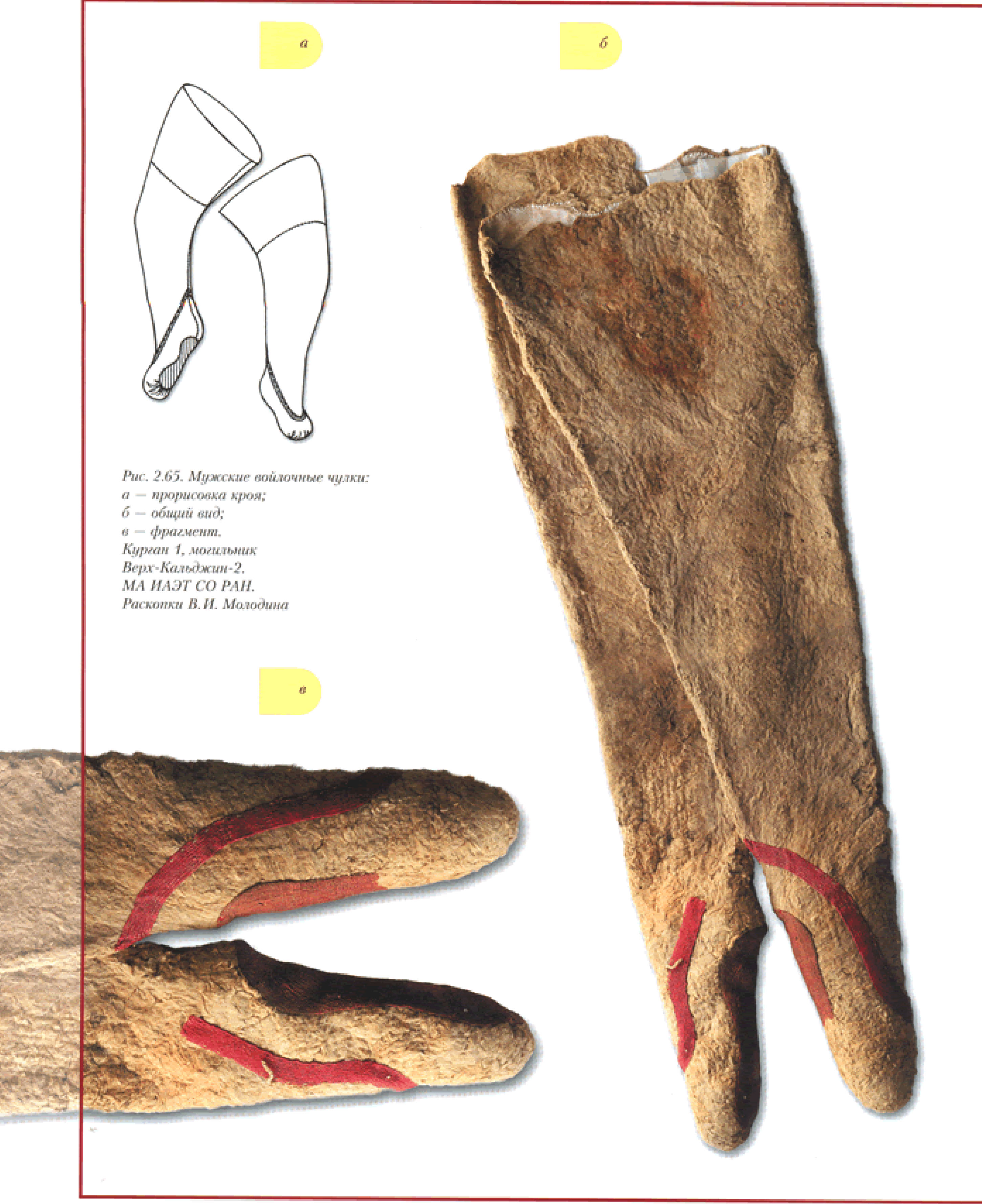 그런데 남성의 스타킹에 발 부분이 가죽으로 다시 만들어서 입힌 것은 베르흐 칼쥔 II유적의 3호분이 유일하다. 같은 유적의 1호분 남성 스타킹은 발바닥 부분만 붉은 펠트로 덧댄 것이다.