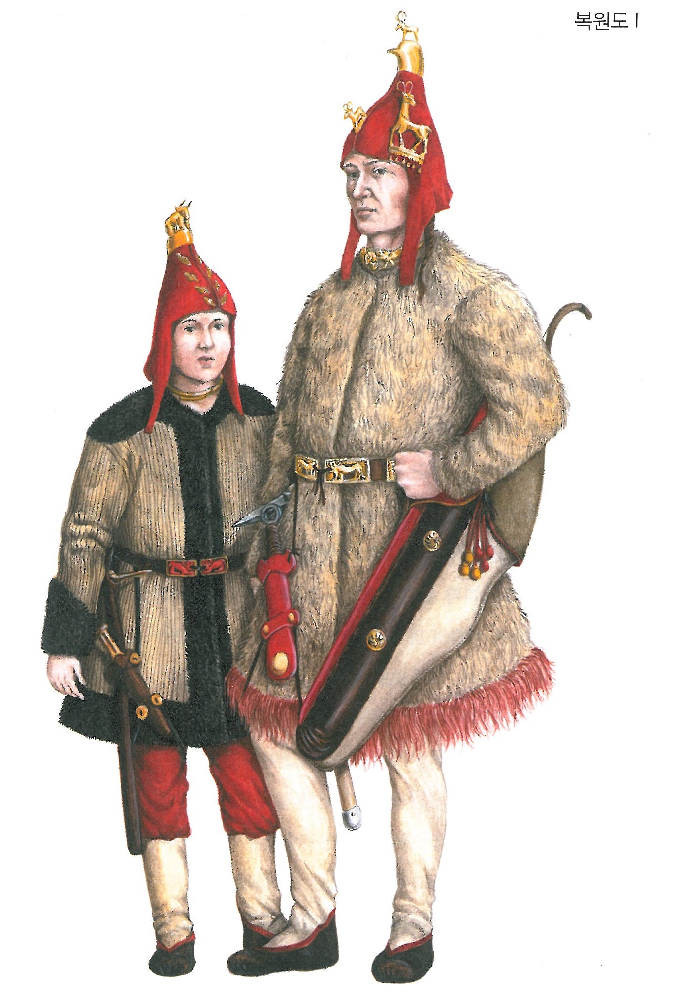 그림 4에서 베르흐 칼쥔 II유적의 3호분 기마전사는 모피코트를 입은 모습이지만, 벨트는 무문양이었는데, 호랑이 문양 장식이 그려져 있다. 그림5는 모피코트를 벗고 기마 탄 모습이다. 베르흐 칼쥔 II유적 3호분무 덤에서 하의는 출토되었지만, 모피만 입고 있었고, 그 안에 상의는 실제로 입고 있지 않았다. 남성의 상의가 발견된 경우는 파지릭 2호분인데 이를 참고로 복원한 것이다. 이 남성의 무덤에서 발견된 남성의 타이즈 끝에 가죽으로 덧댄 것을 참고로 해서 셔츠의 어깨도 복원한 것이다.