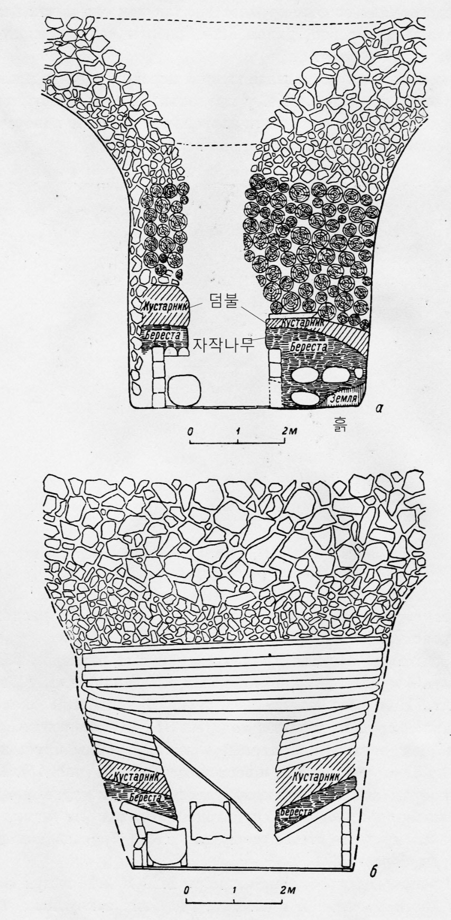 그림 3. 바샤다르 유적의 2호분 단면도(위: 위도방향(남북), 아래: 자오선방향(동서)