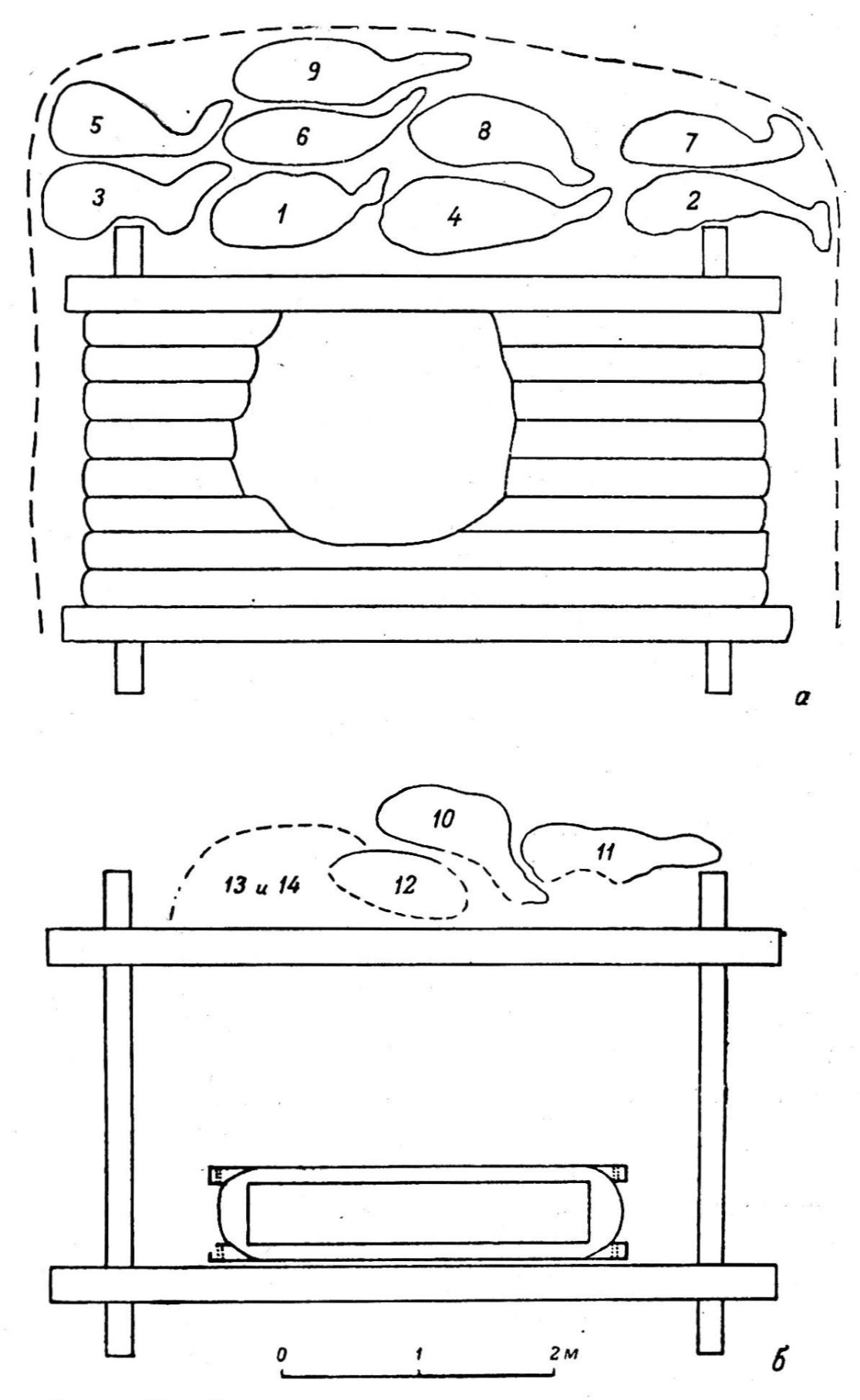 무덤방의 바닥에는 두께 17~18cm의 나무 4개를 깔고 그 위에서 두께 6cm의 통나무를 세 개씩 세워서 무덤방의 한 벽은 통나무 4개를 세워서 만든 것이다. 무덤방의 덮개는 8개의 통나무로 아주 조밀하게 만들어졌다. 무덤방의 크기는 2.2×4.15m, 높이는 1.3m이다. 무덤구덩이에서 남쪽은 무덤방이 설치되고 북쪽에는 말이 매장되는데 14마리가 확인되었다.