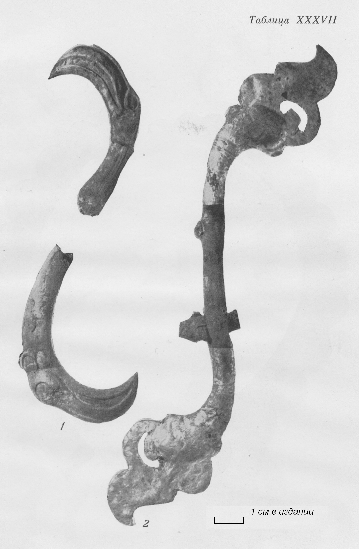 그림 5. 바샤다르 유적 2호분 출토, 재갈멈치, 1-나무, 2-청동(그림1,3의 재갈멈치와 동일).