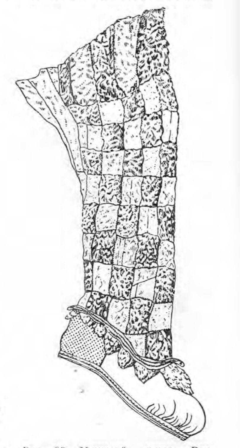 그림 2는 일종의 부츠로 발 부분과 다리(부츠레그) 부분의 재질이 다르다. 신발 부위를 두꺼운 가죽으로 만들고 부츠레그 부위는 모피로 만들었다. 이 부츠는 무릎 약간 위에까지 오는 길이로, 신발과 부츠레그 사이에는 양모끈으로 이음줄이 만들어졌고, 부츠레그는 앞(60cm)이 뒤(43cm) 보다 길다. 부츠레그 부분은 3.5×5cm의 모피조각(갈색과 검은색)을 이어서 바둑판처럼 만들었다. 검은색 모피는 안감이 없고 이 보다 밝은색(갈색)의 모피는 가죽안감을 덧댄 것이다. 사각형 가운데서 4~5개의 같은 재질의 조각을 이어서 큰 사각형으로 만들었다.
