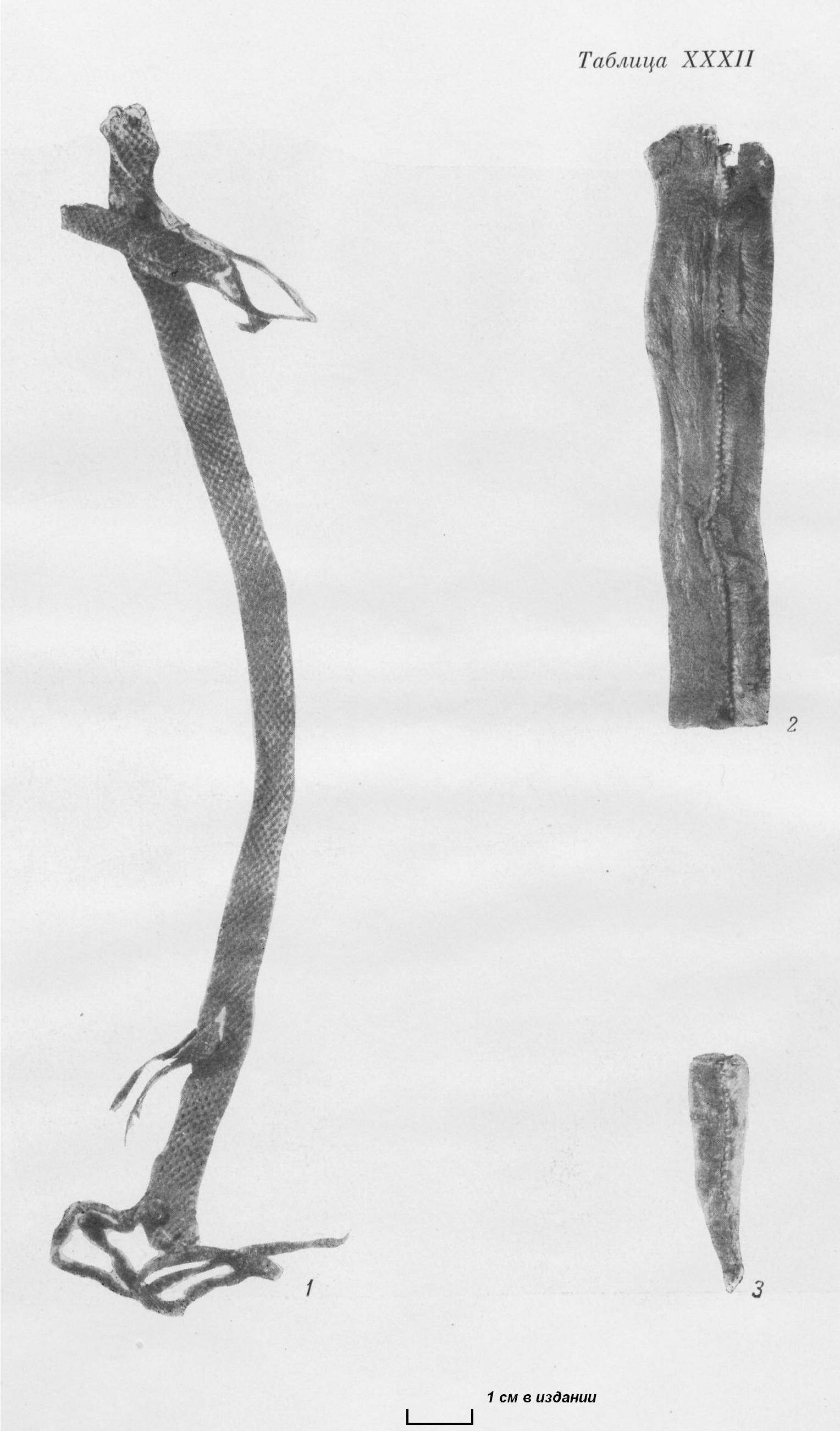 그림 4. 바샤다르 유적 2호에서 출토된 펠트제 벨트(1)와 가죽검집(2,3)