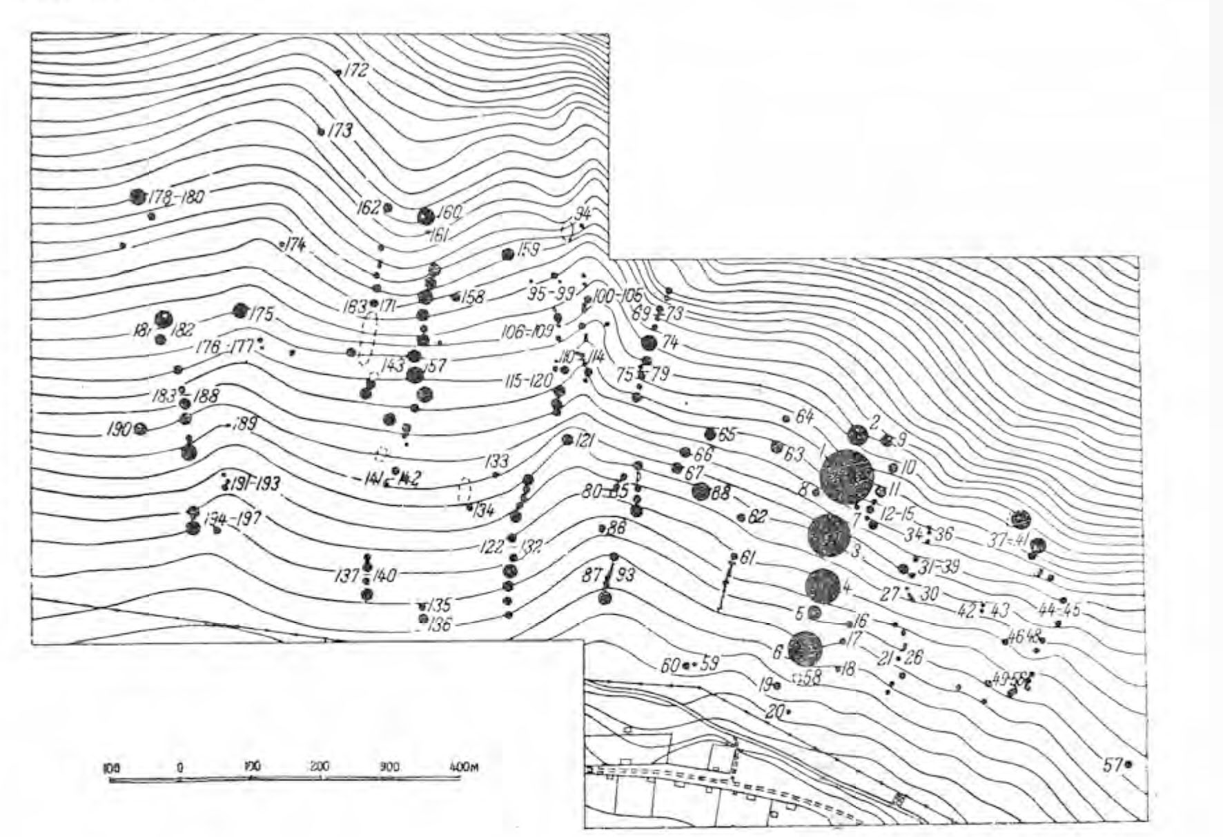 1호는 지름이 68m, 높이는 4m로 초대형 무덤이다. 무덤을 덮은 돌은 대략 6000평방미터 가량이었는데, 돌을 덜어내기 위해서 트럭을 이용해서 돌을 옮겼다. 그림 5의 하단에는 당시 투엑타 마을이 표시되었는데, 도로가 표시되어 있다.