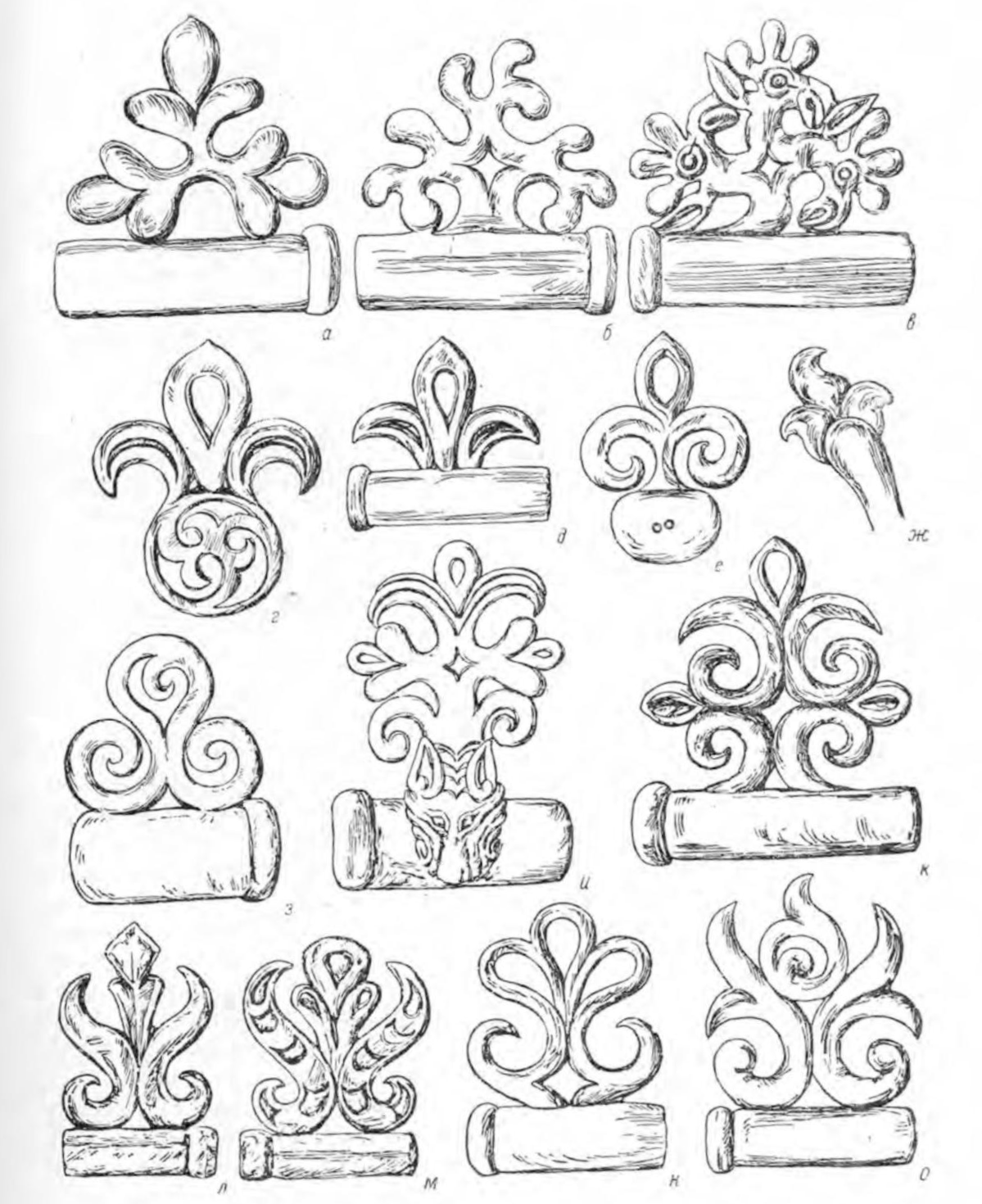 투엑타 유적에는 특히 풀을 표현한 많은 장식판(그림 3)이 있는데 그 중에 가장 많은 장식판이 그림 1-3과 같은 판이다. 초본은 그림은 1-4의 모양으로도 확인되는데, 풀이라기 보다는 좀 더 다듬어졌다. 독수리 얼굴(그림 1-7)을 참고로 했을 수도 있다. 물론 동물의 얼굴을 사실적으로 표현하지는 않았지만.