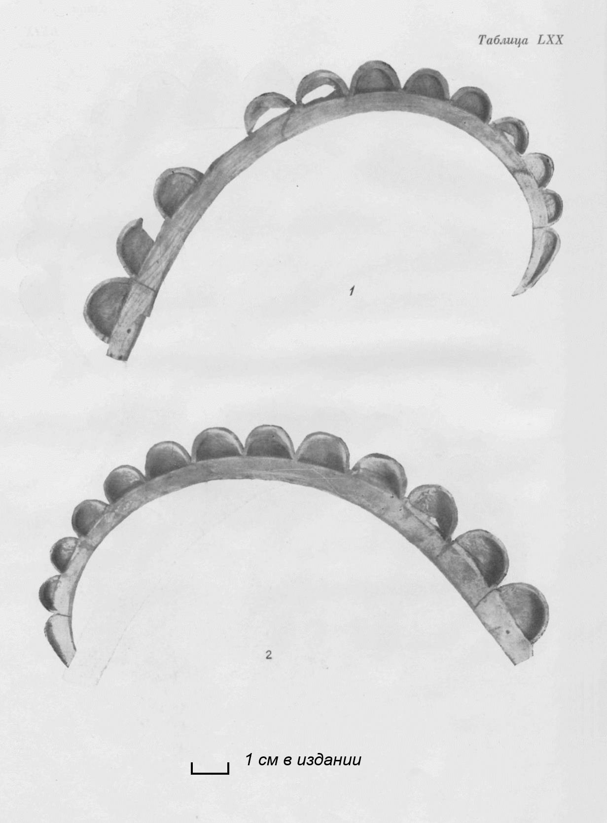 반원형 장식판 8~12cm. 전체 길이 62.5cm, 굽은상태높이 33.5cm(밀리니코프 2018 인용)