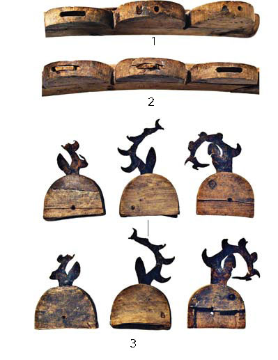 삽입된 반원형 나무장식판은 두 판을 이어 붙인 것이다(그림 7). 옆 면에는 뿔에 삽입해서 고정할 때 필요한 구멍이 있다. 나무 못으로 고정시켰다. 상단에도 또 다른 장식을 삽입하게 위해서 사각형(그림 7-2 왼쪽) 으로 잘라내거나 구멍을 뚫는 경우(그림 8-1)도 있다.