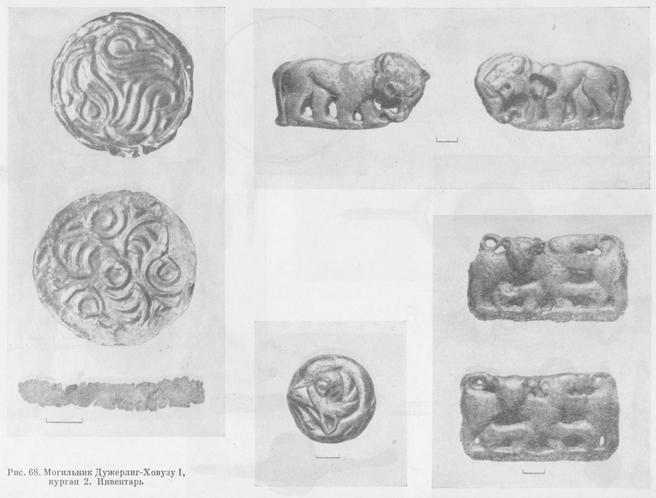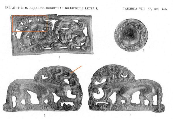 그림 1의 구도와 같은 유물은 시베리아 투바에 있는 주제르긴그-호부주-1(Дужерлиг-Ховузу-I, Duzherlig-Khovuzu-I)(기원전 6~3세기) 유적 1호분(그림5)에서 출토된 황금 원판에 찍힌 표현물, 미누신스크 분지에서 발견된 타가르 문화(스키타이 문화 중에서 미누신스크 분지에서 존재하는 문화)의 기원전 6세기 유물(그림 6-35,36)에서도 볼 수 있다.
