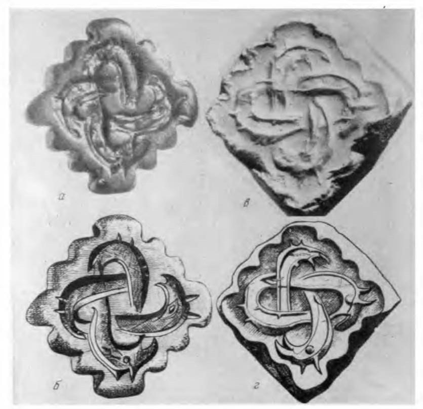 시베리아와 떨어져 있지만 투르크메니스탄 남부에 있는 무르가브 강의 하류에 위치한 콘쿠르(Гонкур,Gonkur) 유적에서는 돌을 새긴 도장(일종의 부적)이 발견되었다(그림 7). 한쪽에는 날개를 편 그리핀, 반대편에는 그리핀 4마리가 십자형 구도(그림 8)로 새겨진 것이다.