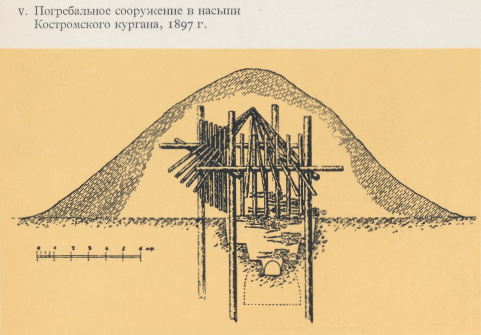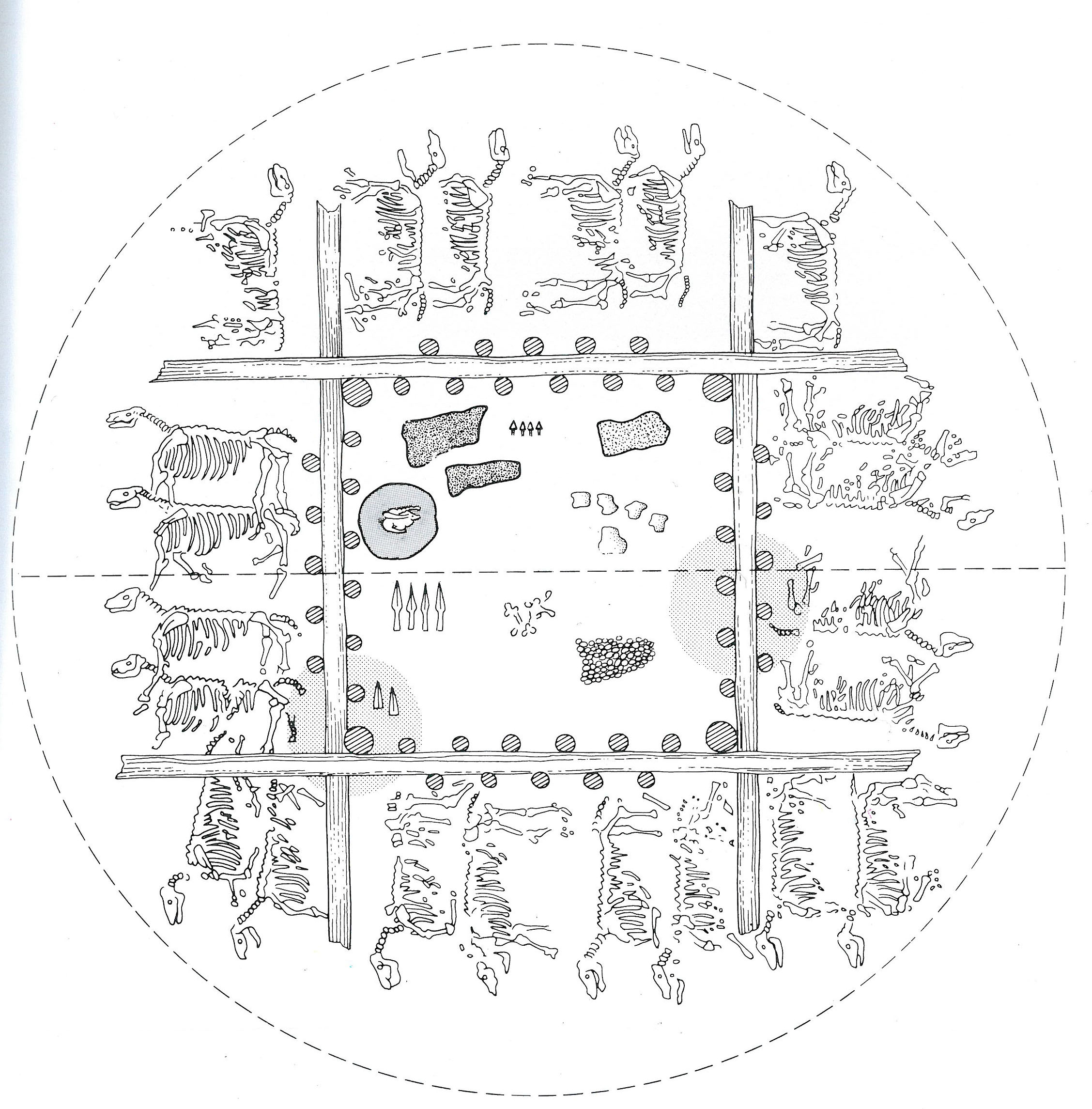 그림 5. 코스트롬스카야 무덤의 단면도, 제물을 받친 기단과 그 위에 말을 부장한 공간을 한꺼번에 그린 것이다.