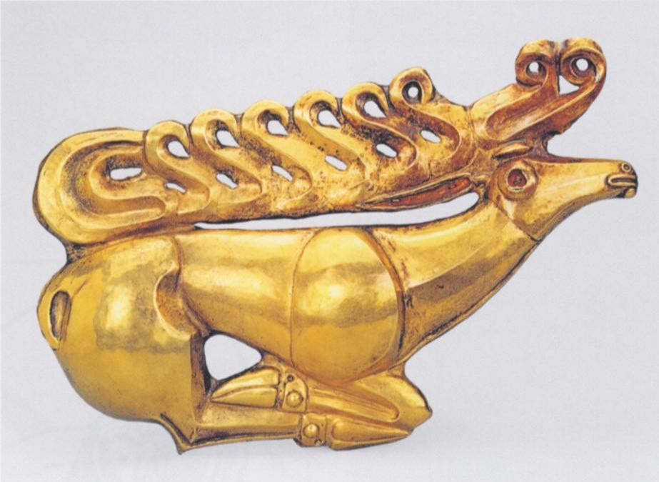 부조로 양각된 사슴문양 방패장식은 불룩하게 만든 면과 면을 이어서 장식한 것으로 흑해 스키타이 문화의 가장 대표적 유물로 일컬어진다. 앞에서 설명드린 독수리장식(멜구노프)은 앞면을 음각해서 나타낸 것이다. 이 유물은 금판의 뒷면을 눌러서(음각해서) 앞면을 불룩솟게 하는 방법으로 표현하는 부조방법이다.