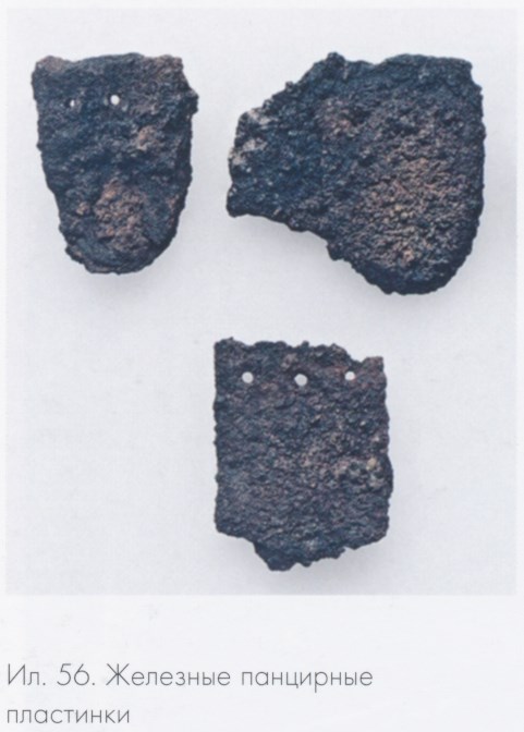 그림 6. 켈레르메스 유적 출토 철제 비늘갑옷(갈리아나 2006), 철판 수백개가 이어져서 갑옷(상반신)이 된다. 코스트롬스카야 유적에서도 철제갑옷이 알려졌지만 도면은 19세기 보고서에 남겨진 것으로만 알려졌다(체르넨코 1968).
