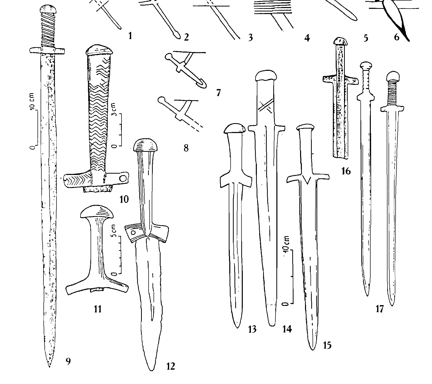 그림 3. 흑해 스키타이 문화의 이른 시기 검(9~12:철, 13~17: 청동) 9-수보토프스키(Субботовский, Subbotovskiy 마을유적, 10-수보로보(Суворово, Suvorovo 유적, 11-무게르간스키(Мугерганский, Mugerganskiy 12-모그-카 파르스(мог-ка Фарс, mog-ka Fars, 13~15: 알타이 출토, 16-세미파라틴스키(Семипаратинский, Semipalatinski) 17-안드례프스코예 오제로(Андреевское озеро, Andreevskoe lake 유적(코발레프 2000인용)