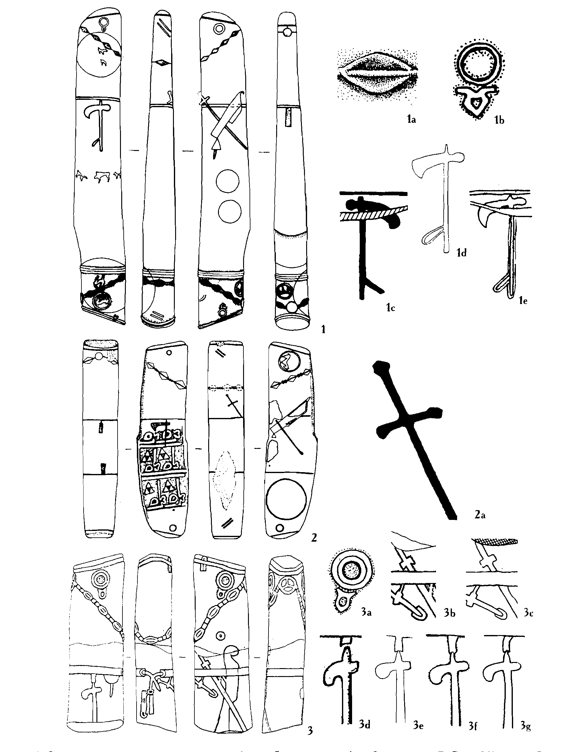 그림 1. 흑해 스키타이 문화의 사슴돌(코발레프 2000), 1-주보프스키 유적, 2-우스티 라빈스키, 3-키즈부른 유적의 돌 기둥, 각각의 번호에서 같은 유물을 여러 번 그린 것은 연구자마다 무기의 모양을 약간 씩 다르게 인식해서이다.