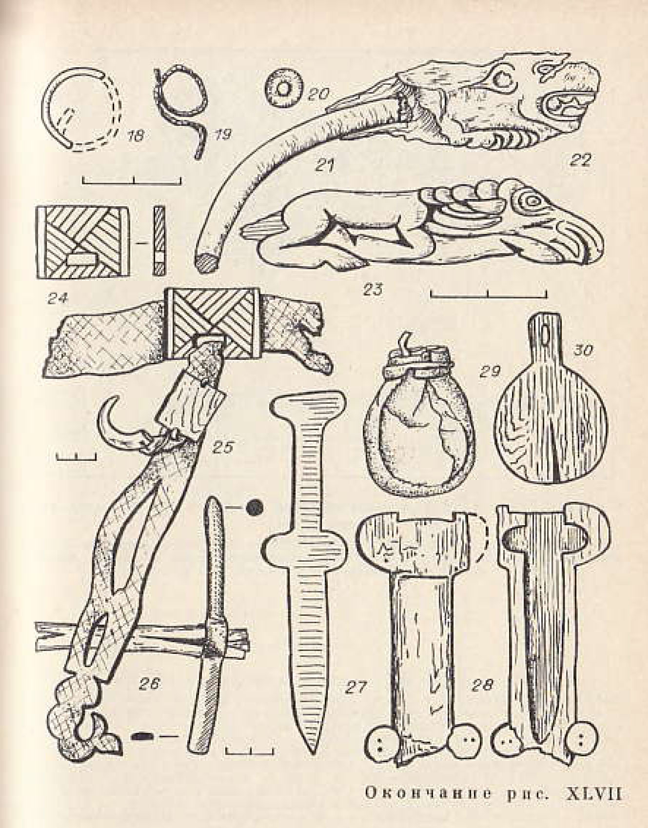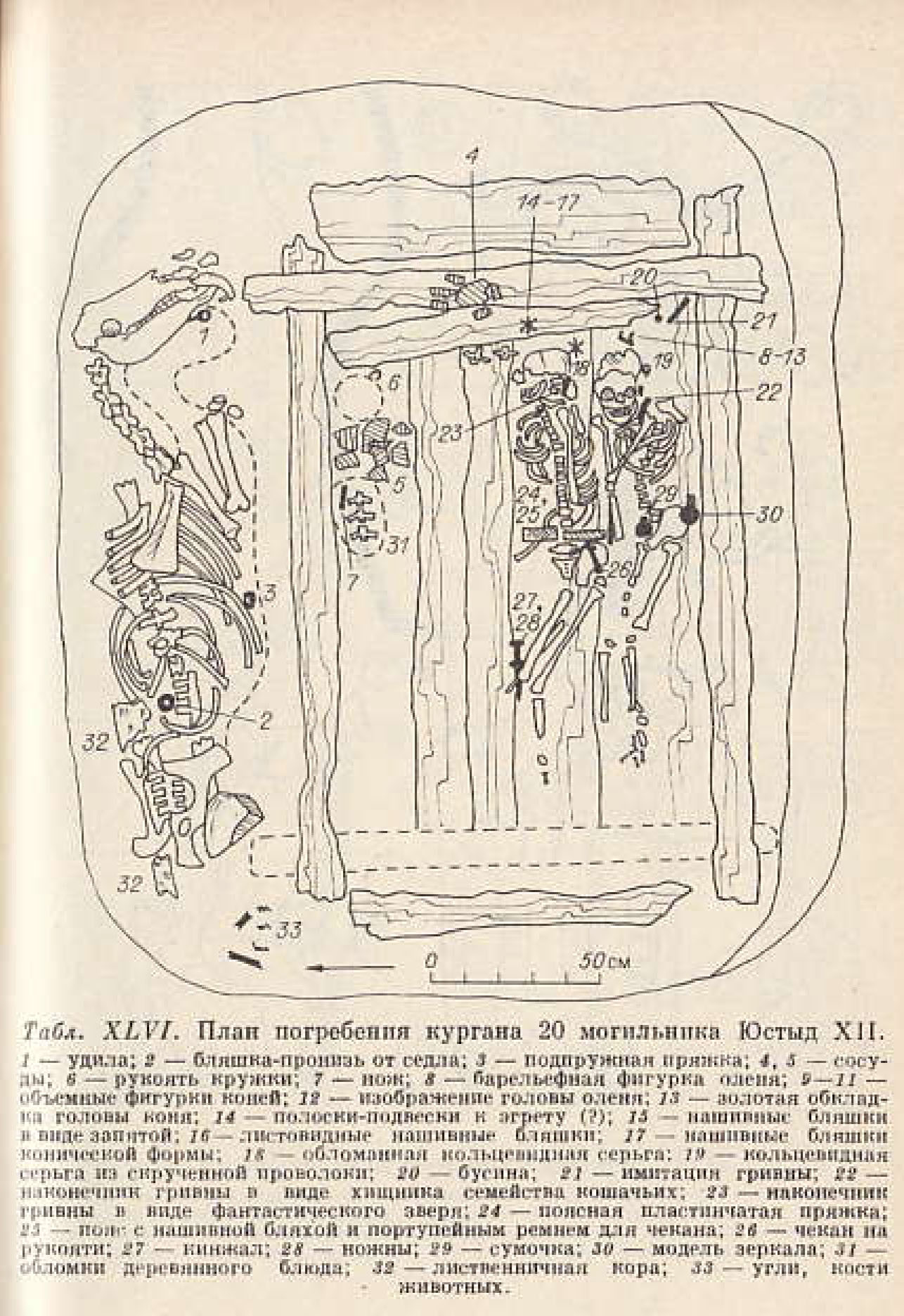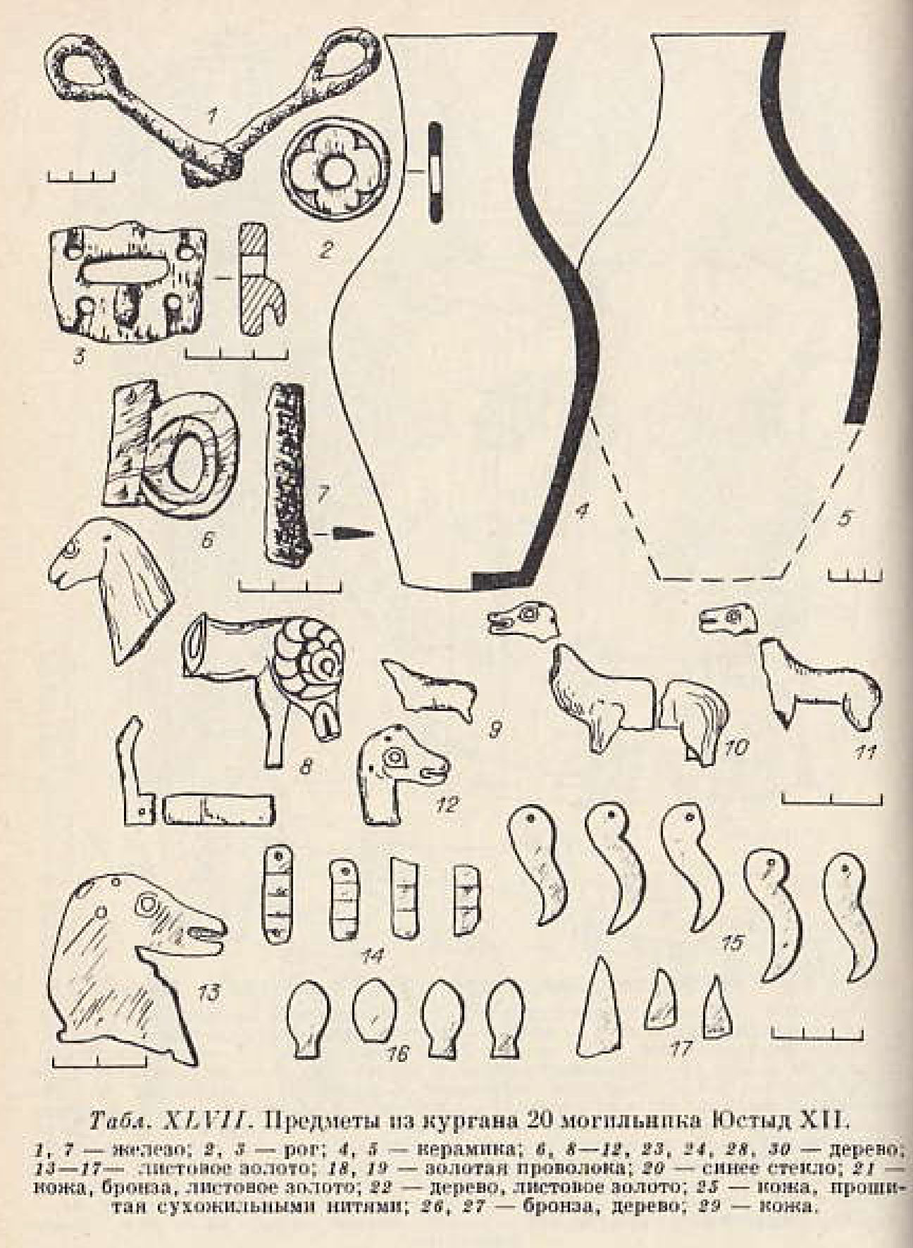 그림 1. 유스티디 XII유적의 20호 무덤, 1-재갈, 2-안장장식판, 3-장방형 버클장식판, 4,5-토기, 6-잔의 손잡이, 7-칼, 8-산양화 된 사슴의 조각품, 9-11: 말 형상품, 12: 사슴머리 장식판, 13-금판제 말머리, 14-금제 장식판, 15-S자형 장식판, 16-나무잎모양 장식판, 17-원뿔모양 장식판, 18-고리모양 귀걸이, 19-고리모양 귀걸이, 20-구슬, 21-목걸이 모형,22-맹수머리모양의 목걸이 끝장식, 23-그리핀 모양의 목걸이 끝장식, 24-허리띠 장식, 25-전투용도끼와 연결되는 허리끈의 장식, 26-손잡이 달린 도끼, 27-검, 28-칼, 29-주머니, 30-모형 거울, 31-깨진 목제쟁반, 32-낙엽수의 껍질, 33-동물뼈와 숯