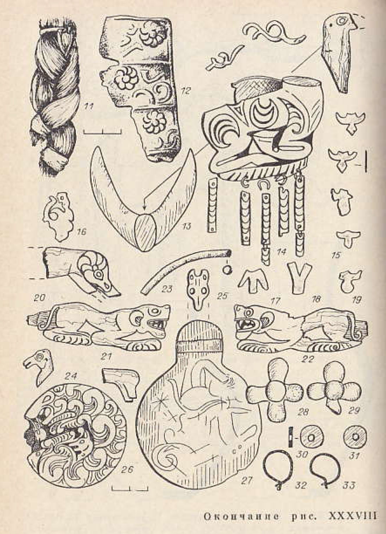 그림 1. 유스티드 XII유적의 16호 무덤, 1,2-재갈, 3-재갈멈치, 4-굴레장식, 5,6-항아리, 7,8-칼 편, 9-전투용도끼의 손잡이, 붉은색 색칠, 10-검, 11-여성의 땋은 머리카락 조각, 12-장식조각, 13-V자모양의 사슴조각, 14-모자장식(aigrette), 15~19: 금판으로 만든장식, 20-산양몬양의 사슴, 21~22: 맹수끝장식이 달린 목걸이, 23:나팔모양 목걸이 편, 24-말 모양 조각, 25-몸을 말고 있는 맹수장식이 표현된 원판모양, 거울장식, 25~27: 거울, 28,29-십자형 장식판, 30,31-구멍둘린 원판모양, 32,33-고리모양 귀걸이, 34-막대기, 35-검은색 물감의 흔적, 36-고리트 안의 활과 시위, 철제(1,2,7,8), 나무(3,4,13,20-22,24,28-31), 토제(5,6), 청동+나무(10,23), 청동(25-27),11(펠트), 금박(15-19), 가죽(14), 주물로 제작된 금(32,33)
