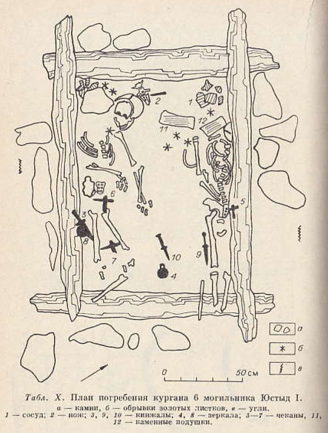 그림 8. 유스티드 I유적의 6호분 평면도와 출토유물, a-돌, b-금박편, c-숯 조각, 1-토기, 2-칼, 3, 9,10-검, 4,8-거울, 5~7:전투용 도끼, 11, 12-돌 베개, 1-토기, 2-철제품, 3~10: 청동제품