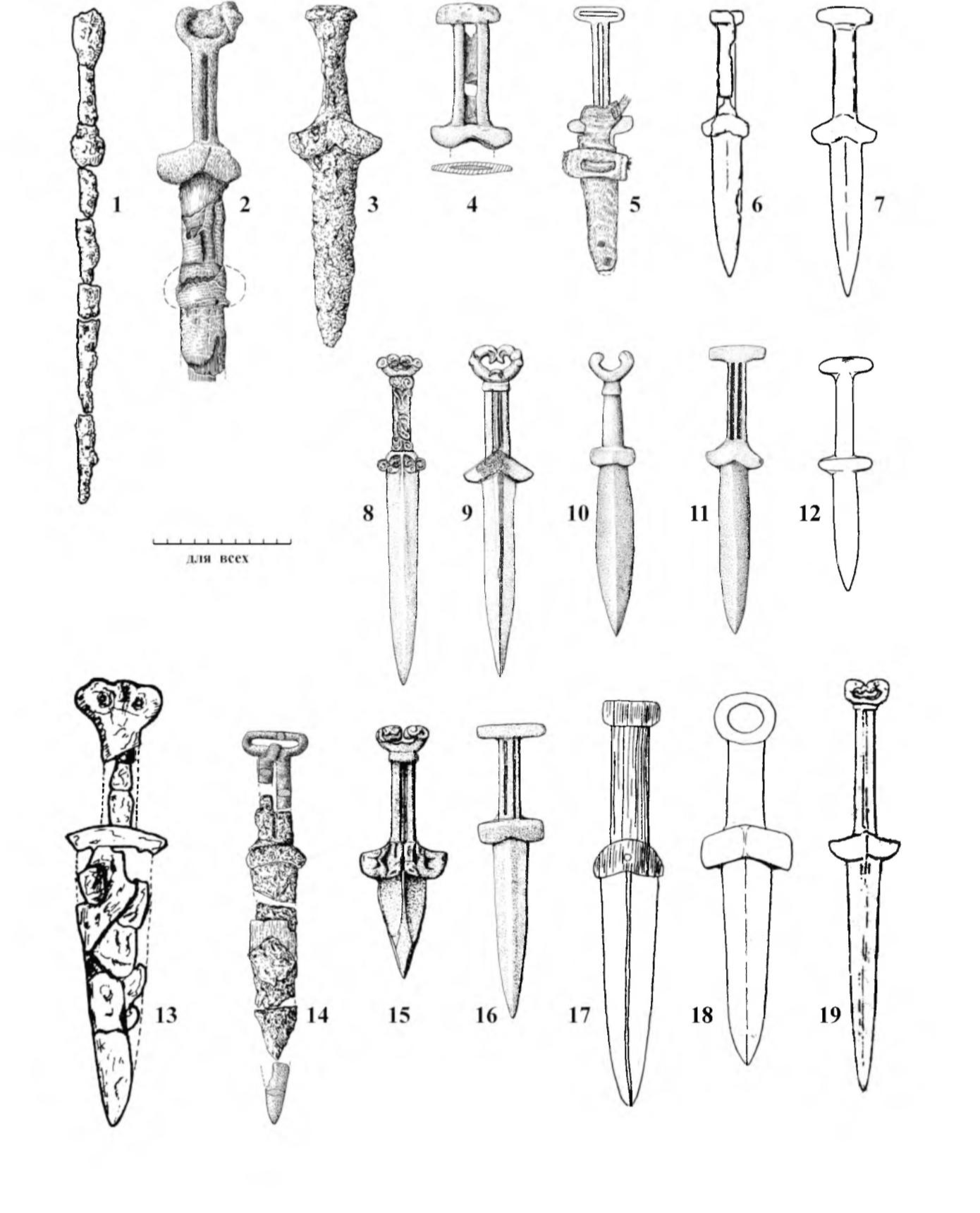 이 유적에서는 재자리가 아닌 모자장식 뿐만 아니라 울란드리크 계곡과 유스티드 계곡을 통틀어서 유일하게 동물장식이 부착된 청동검(그림 2-8)과 전투용 투부(그림 2-7)가 출토되었다. 알타이 추야강변에서 출토되는 파지릭 문화의 청동검은 대부분 손잡이가 T자형이며, 손잡이와 날의 경계에 나비모양으로 벌어진 칼날멈추개가 형성되어 있다(그림 3).