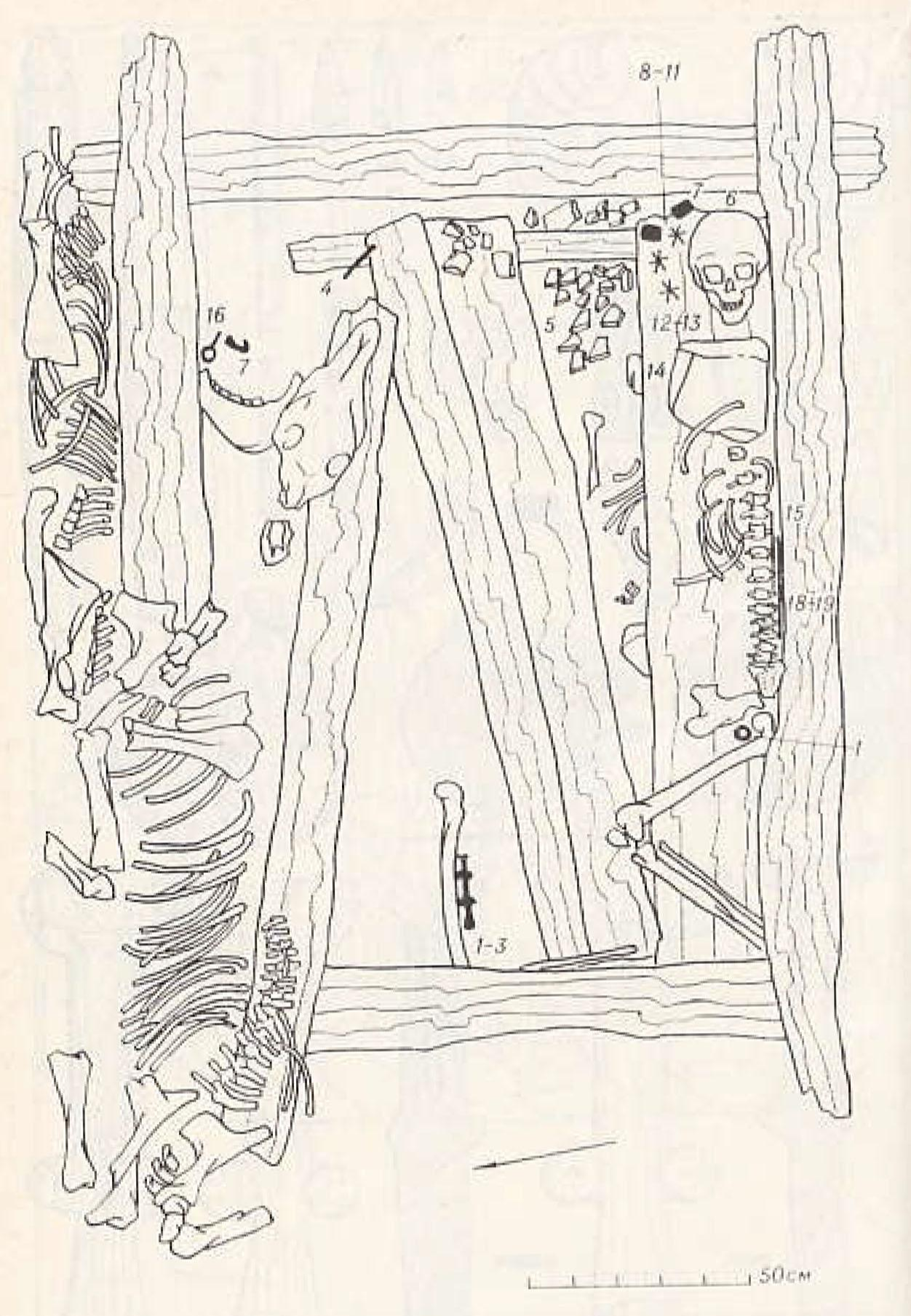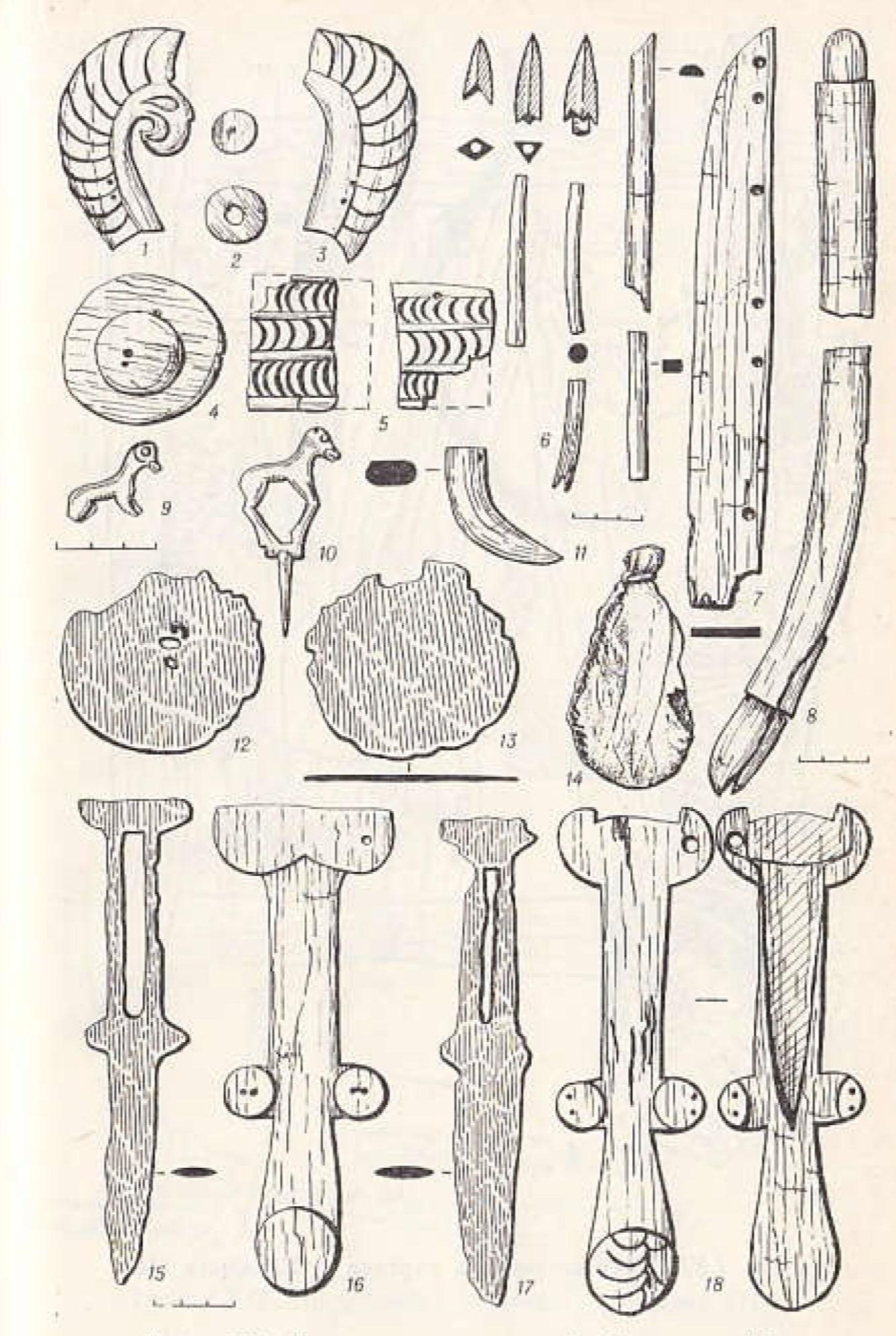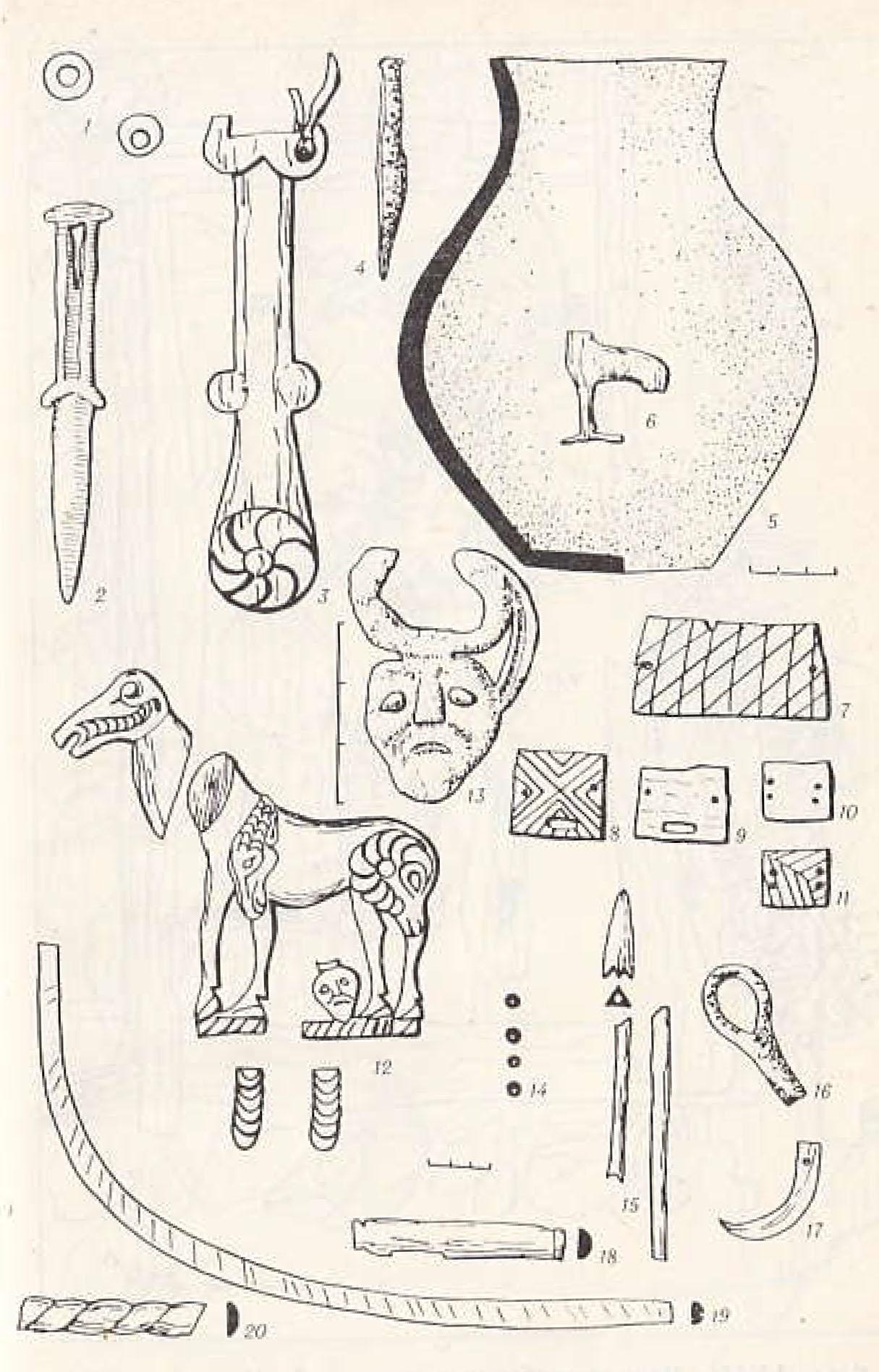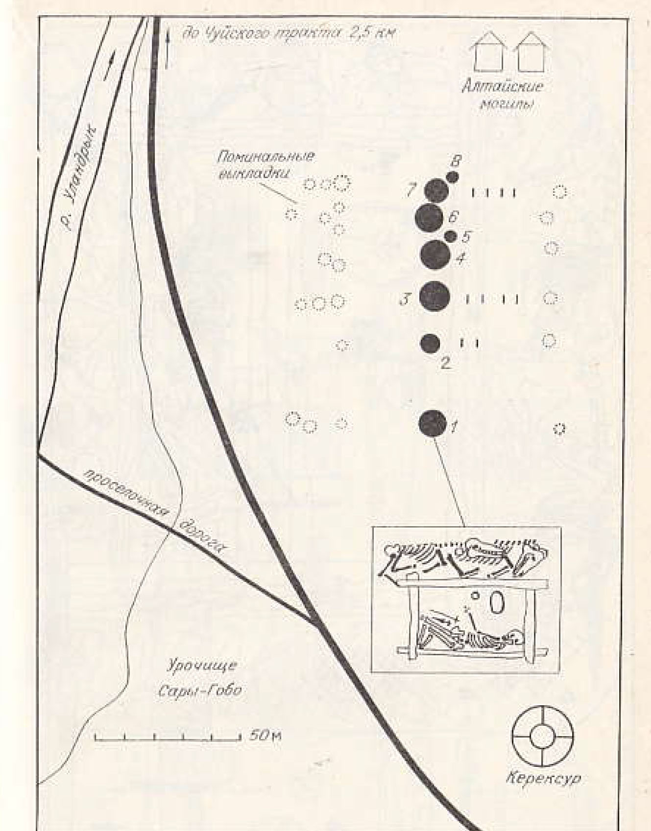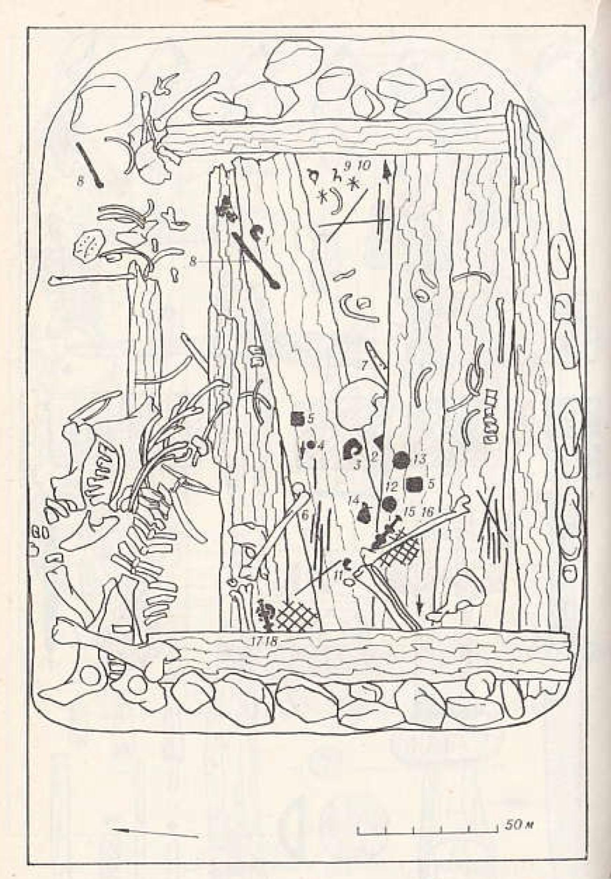 1,3- 목제 굴레장식, 2: 목제 장식판, 4: 말 이마장식(쿠바레프는 고리트 장식으로 보고했으나, 후대에 발굴된 아크 알라하 3유적, 아크 아라하 1유적에서는 이 유물이 말 이마 장식이라는 점이 밝혀졌., 5-목제 장식판, 6-목제 활, 7-목제 고리트 지지대, 8-투부의 손잡이, 9,10-목제 말장식, 11-멧돼지 송곳니 모양의 목제품, 12,13-청동거울, 14-물감이 칠해진 가죽주머니, 15,17-청동검, 16,18-목제검집