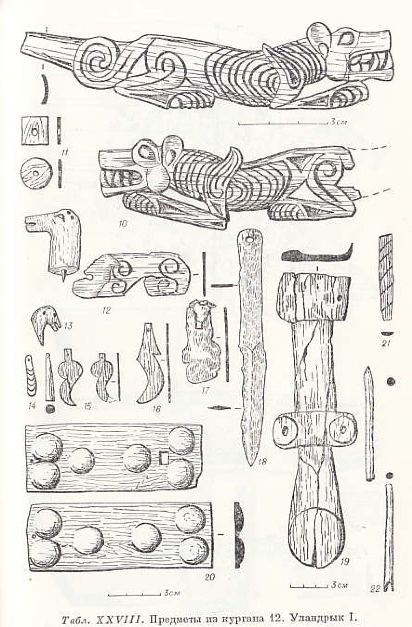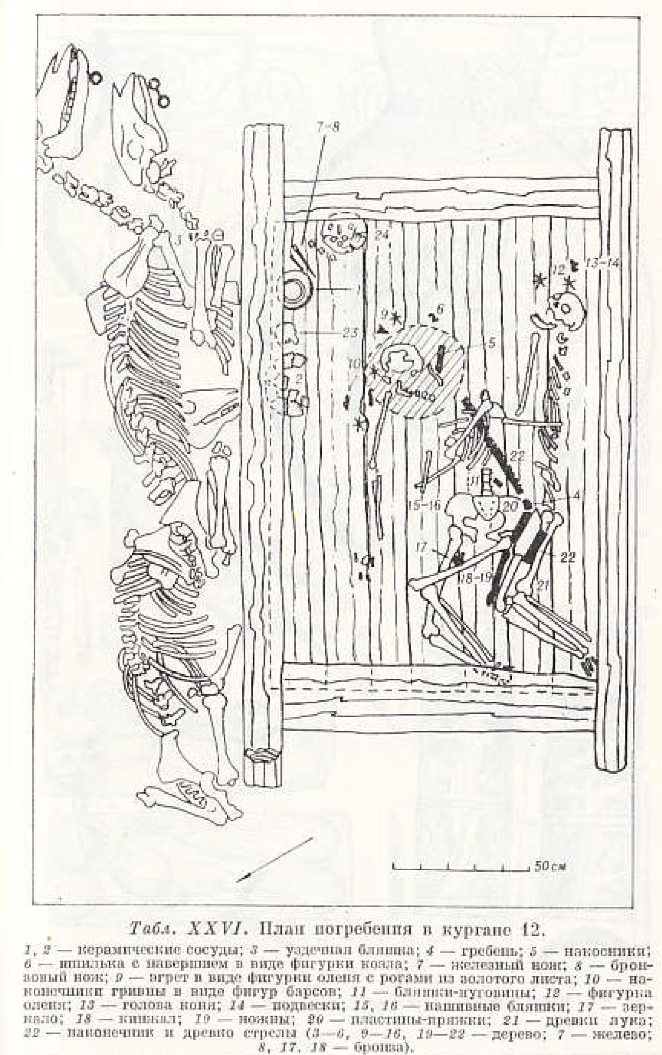 1,2-토제 항아리, 3-장식판, 4-빗, 5-장식판, 6-코젤 모양의 장식판, 7-철제 칼, 8-청동 칼, 9-뿔 달린 사슴 모양이 달린 머리장식, 금박으로 장식됨, 10-그리핀 장식이 달린 목걸이, 11-단추형 장식판, 12-사슴모양 장식, 13-말 모양 장식, 14-펜던트, 15,16-구름모양장식판, 17-거울, 18-검, 19-칼, 20-장식판, 21-활, 22-화살(목제:3-6, 9-16, 19-22, 철제:7, 청동: 8,17,18)