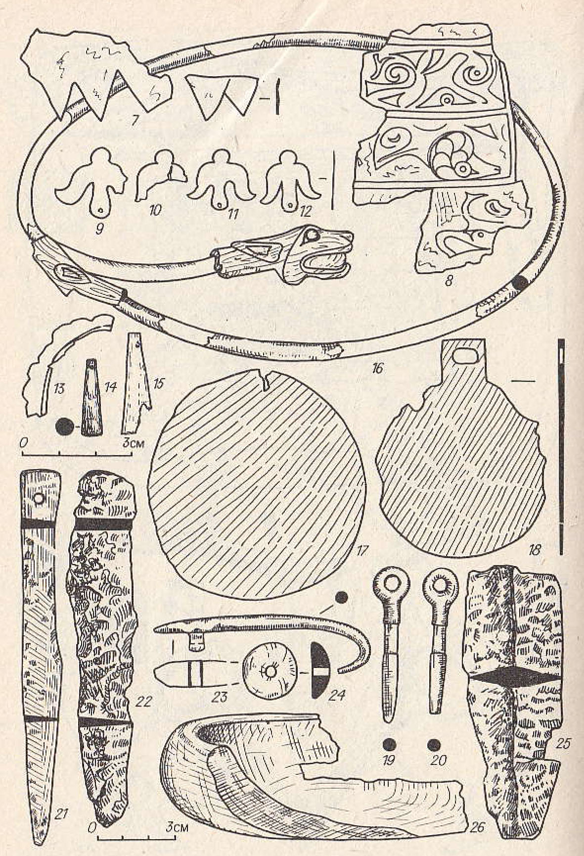 그림 4. 바르부르가지 I유적의 25호 유물 2, 6-이마장식, 7,8-목제 말모양 인형, 9-사슴머리, 10-산양몸통의 사슴,11~14-원뿔모양의 펜던트, 15-빗, 16-모형 검, 17-칼, 18-모형의 전투용 도끼, 19~21: 모형 활, 22-화살통 일부, 23-목제 말뚝,