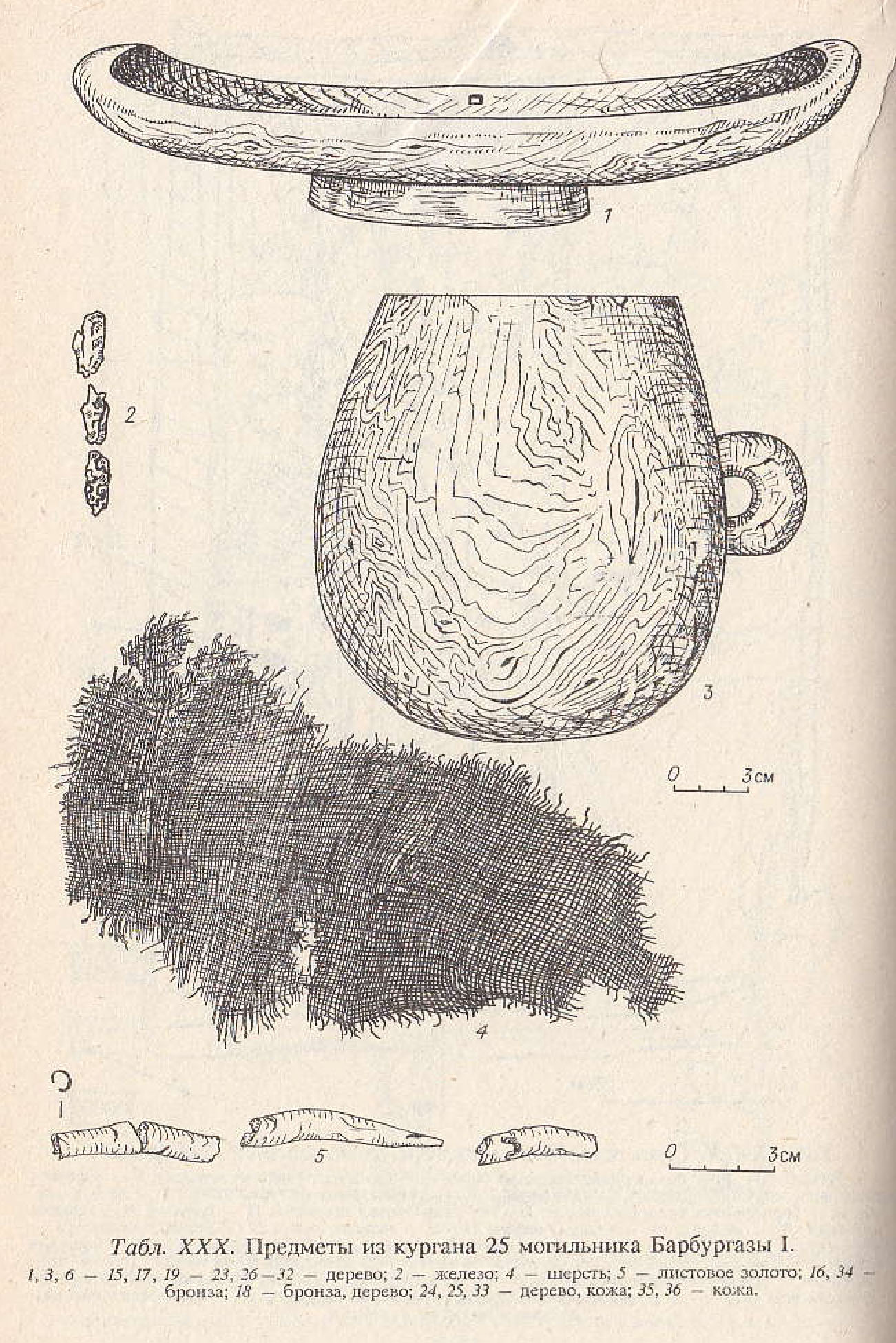 그림 3. 바르부르가지 I유적의 25호(미라무덤) 유물, 1-목제쟁반, 2-칼, 3-목제 잔(손잡이가 둥근), 4-의복조각, 5-목걸이를 둘러싼 금박종이 조각