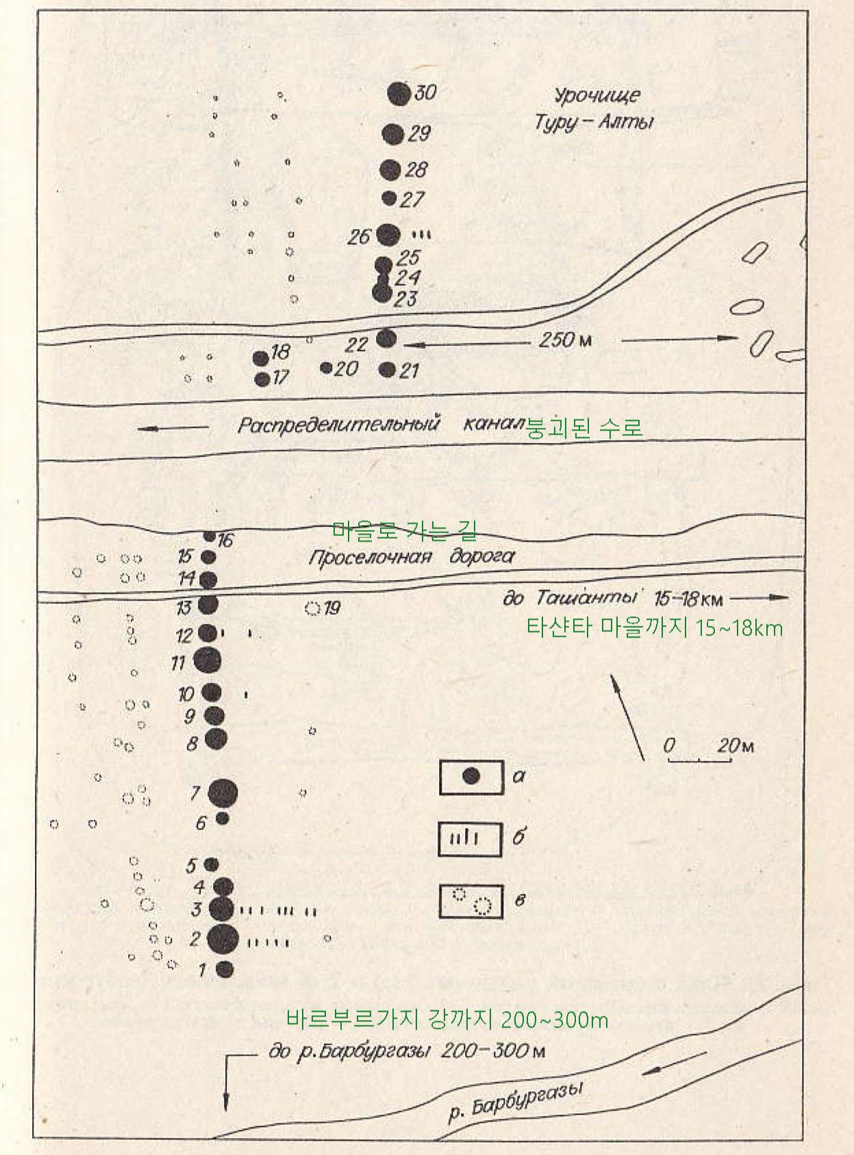 알타이 추야강의 지류인 바르부르가지 강 유역의 스키타이 무덤인 바르부르가지 I유적에서는 서른 기의 무덤이 발견되었다. 근현대에 들어선 수로 덕분에 무덤은 2그룹으로 나누어진 것처럼 보이지만 처음 축조 될 때부터 2열로 축조되었다. 그 중앙을 후대에 공교롭게도 수로가 들어선 것으로 보인다. 서른기의 무덤가운데 고대 투르크시대의 것은 19,20호이다.