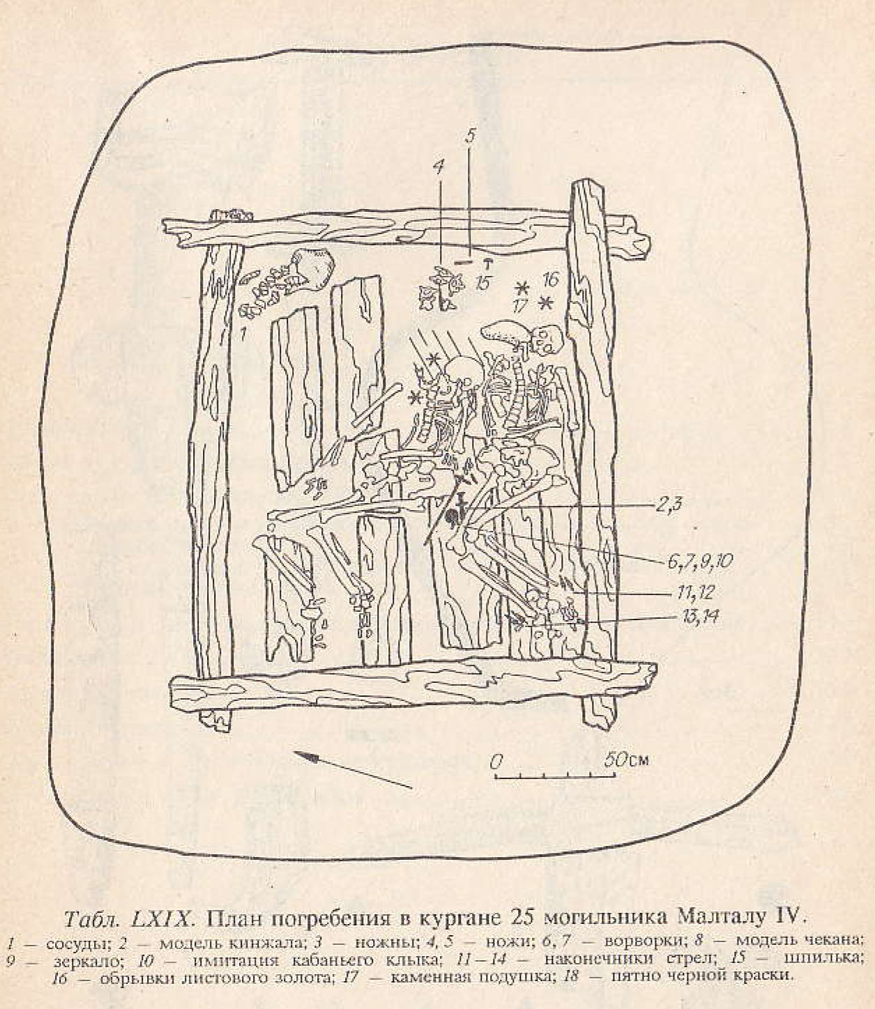 그림 3. 말라투 IV유적의 25호 무덤 평면도, 1-토기, 2-모형 검, 3-검 집, 4,5-칼, 6,7-원판형 펜던트, 8-모형 투바 9-청동거울, 10-멧돼지 송곳니 모양, 11-14: 화살촉, 15-청동 못, 16-금박편, 17-돌 베개, 18-검은색 물감의 범위 (1-토제, 29-청동, 3,6,7, 10-목제, 4,5,15-철제, 8-청동과 목제, 11-14: 뼈)