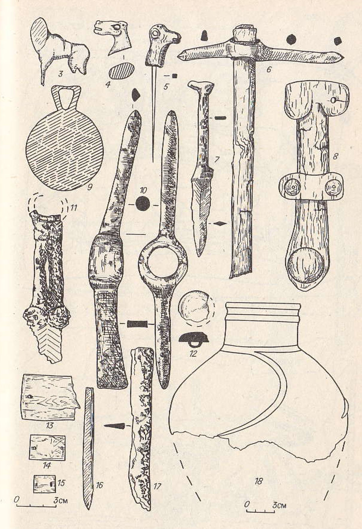 그런데 바르부르가지 I유적에는 이제까지 보이지 않았던 산양장식(그림 2-7,8)을 단 목걸이가 발견되었다. 18호 석관묘에서 발견되었다. 이 남성은 모자에도 동물문양장식을 달았다(그림 2-4,6,7). 산양몸통에 사슴머리를 한 장식(그림 2-4), 말 장식(그림 2-6.7)이다.