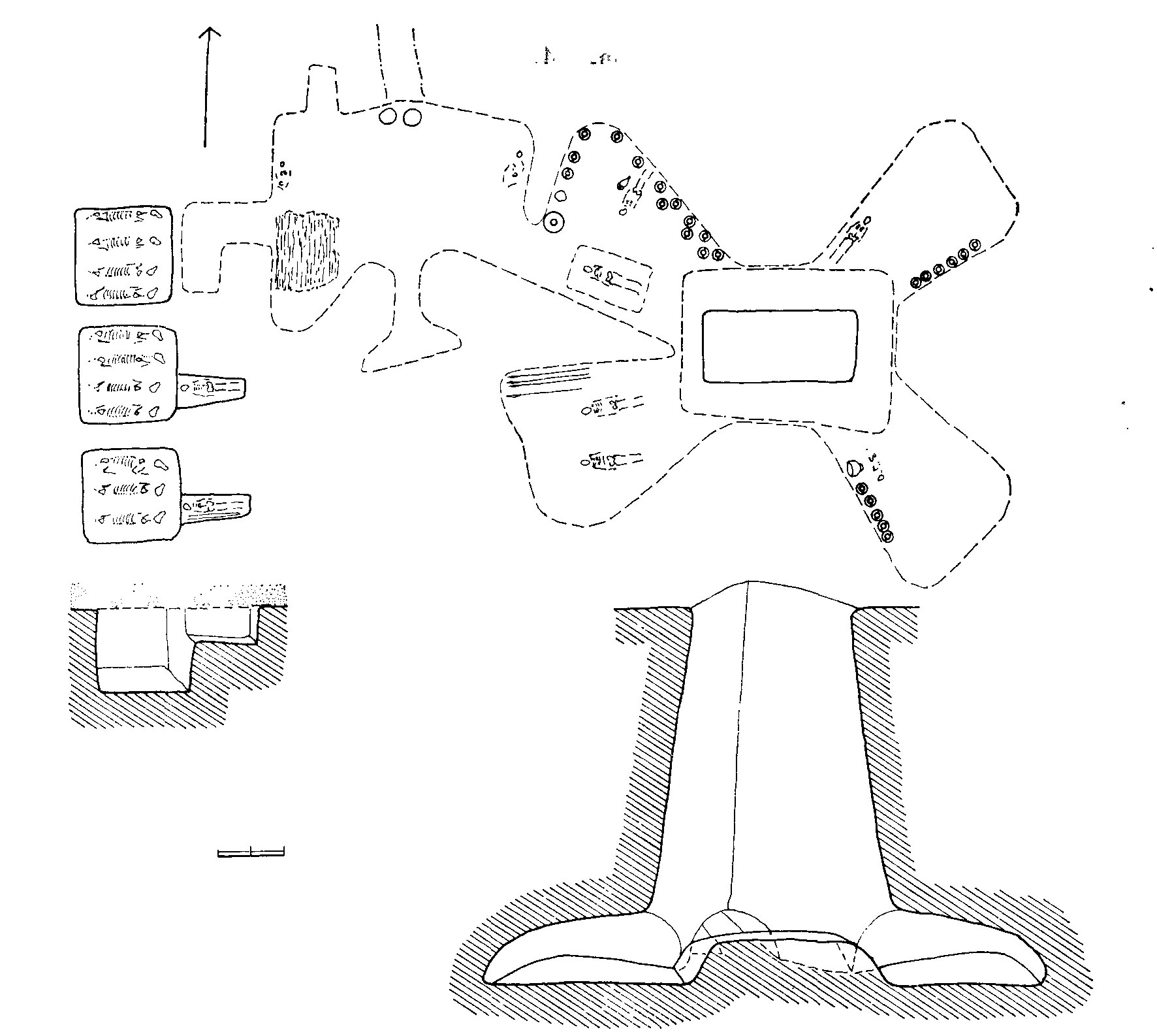 그림1. 체르토믈리크 유적 단면도(위)와 평면도(아래), 평면도는 그림 2와 방향이 다름, 이 그림에서 북쪽은 오른쪽, 자벨린 작성( 알렉세프외 1991)