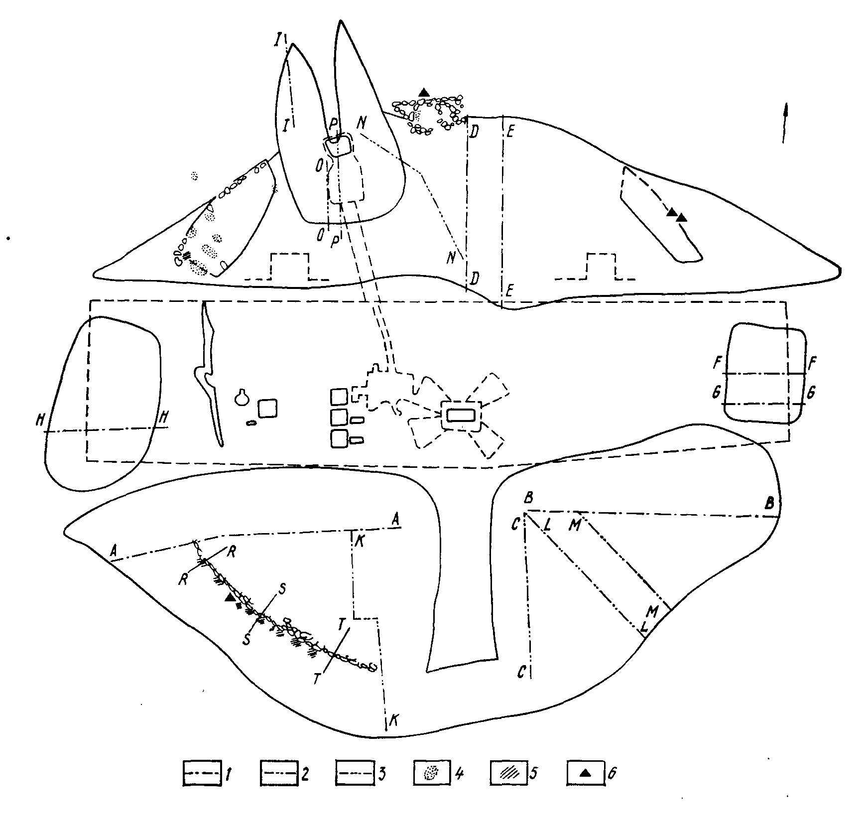 그림 2. 체르토믈리크 유적 평면도, 자벨린 작성( 알렉세프외 1991), 무덤을 둘러싼 호석을 벗기고 난 후 무덤 바닥의 평면도, 무덤의 입구는 ‘P’, 북쪽은 화살표의 끝방향