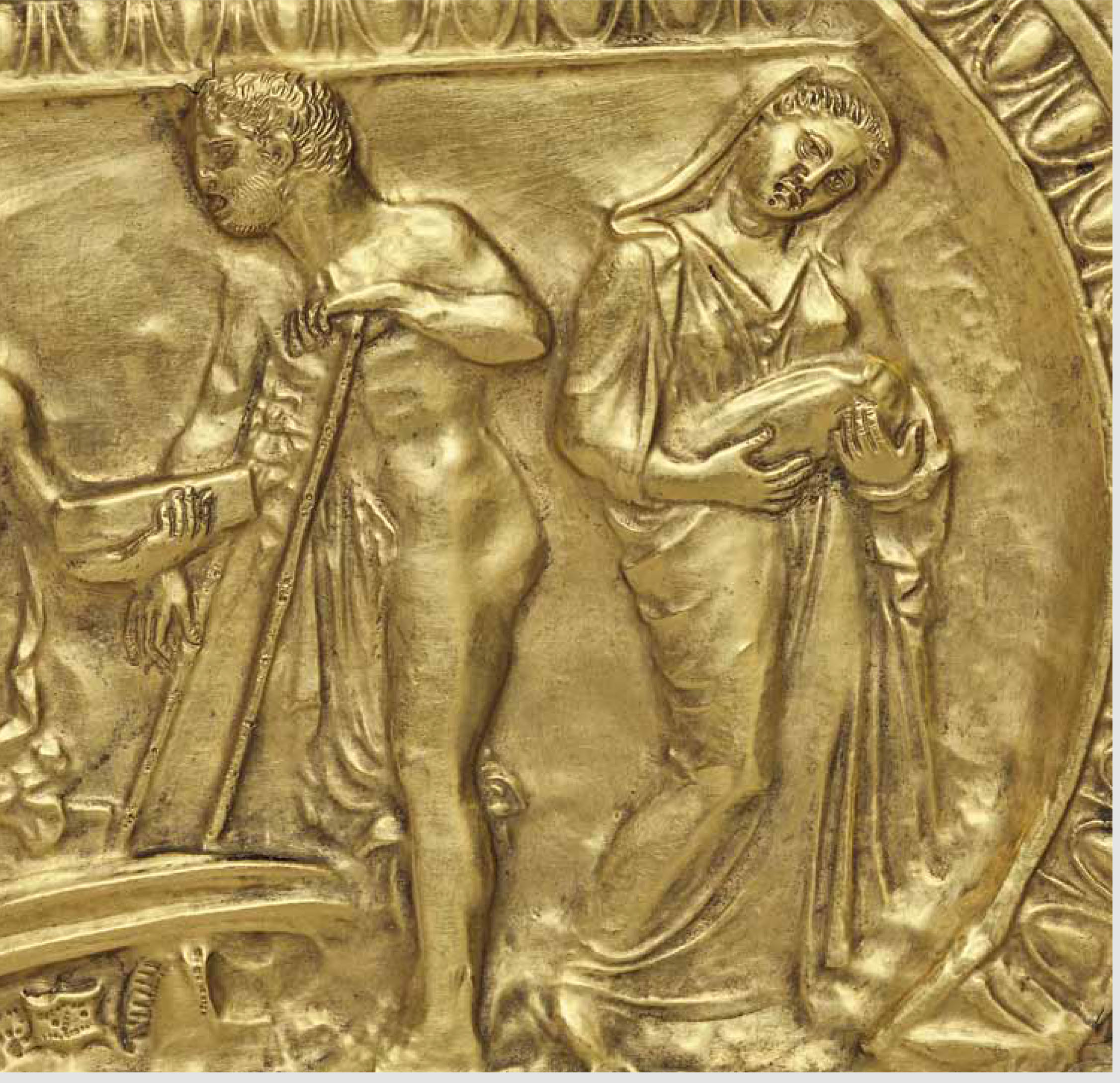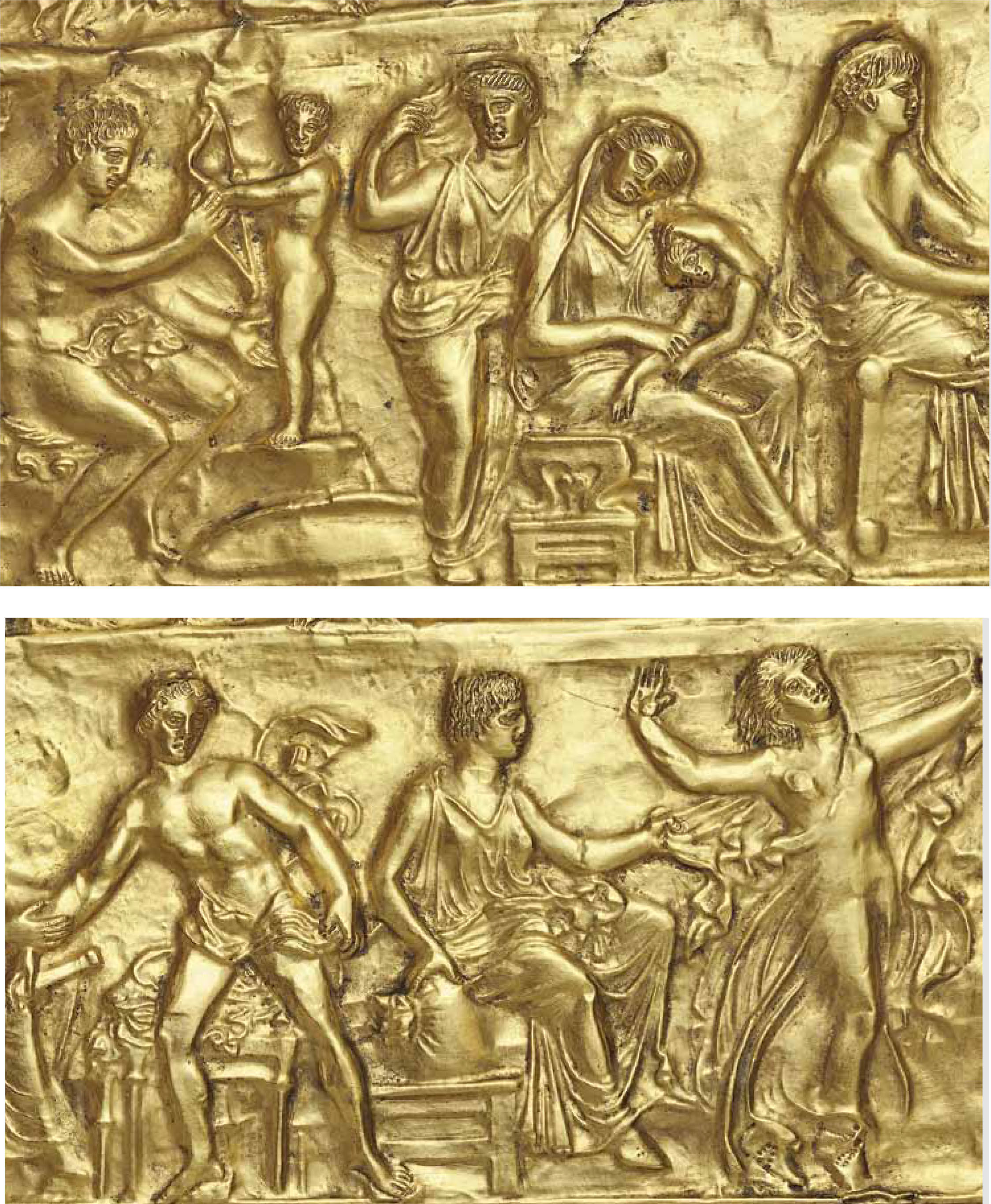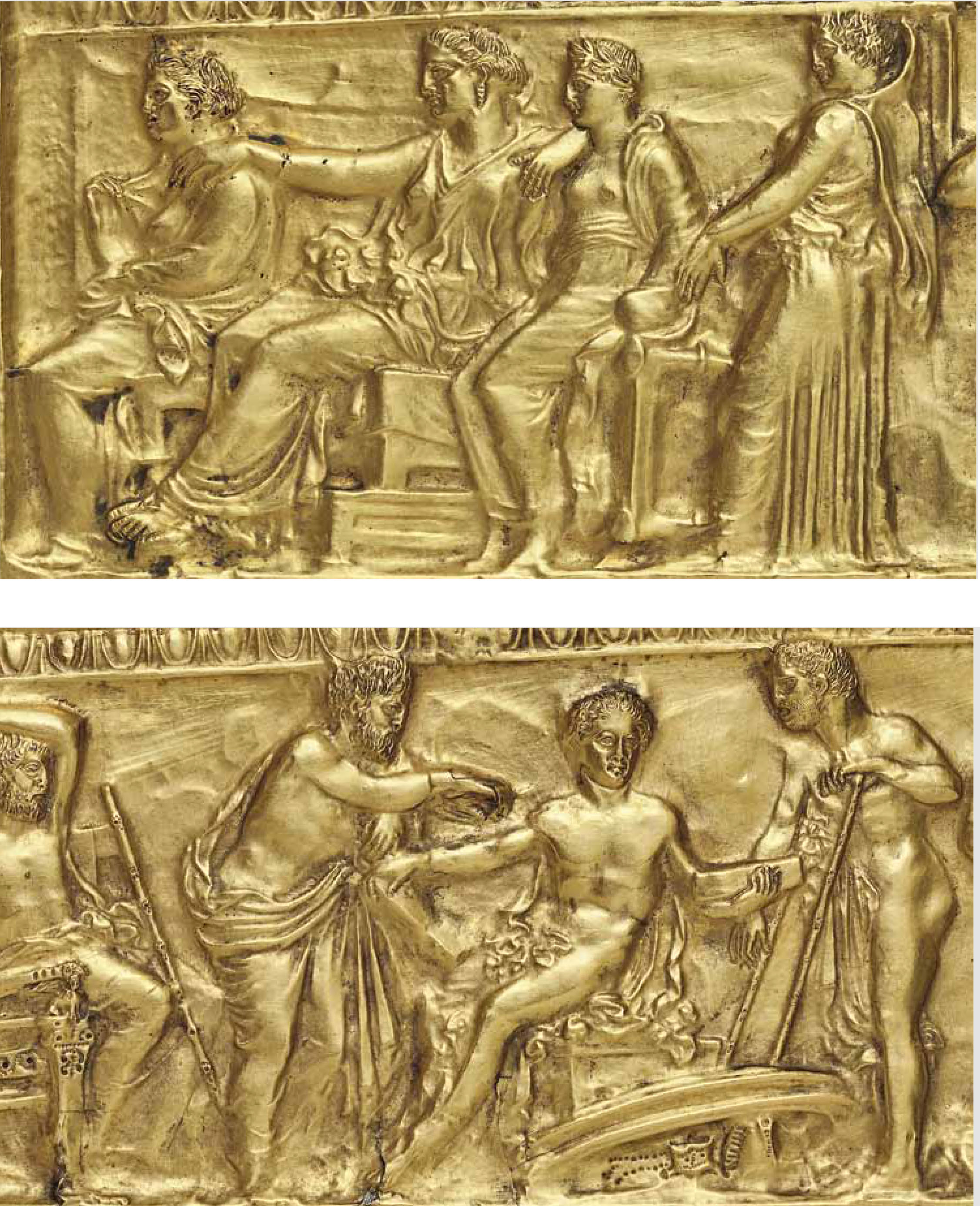 중앙은 그리스 신화의 한 장면이다. 주인공은 상단왼쪽 에 있는 활을 들고 있는 어린아이가 아킬레스다(그림 3-위). 두번째 장면은 스코로스 섬의 리코메데스 궁전에 아킬레스를 여장해서 숨기는 장면, 리코메데스의 딸 사이에서 아킬레스가 본래의 모습을 드러내고(그림 3-아래), 리코메데스 왕에게 아킬레스가 작별인사하는 모습이다.