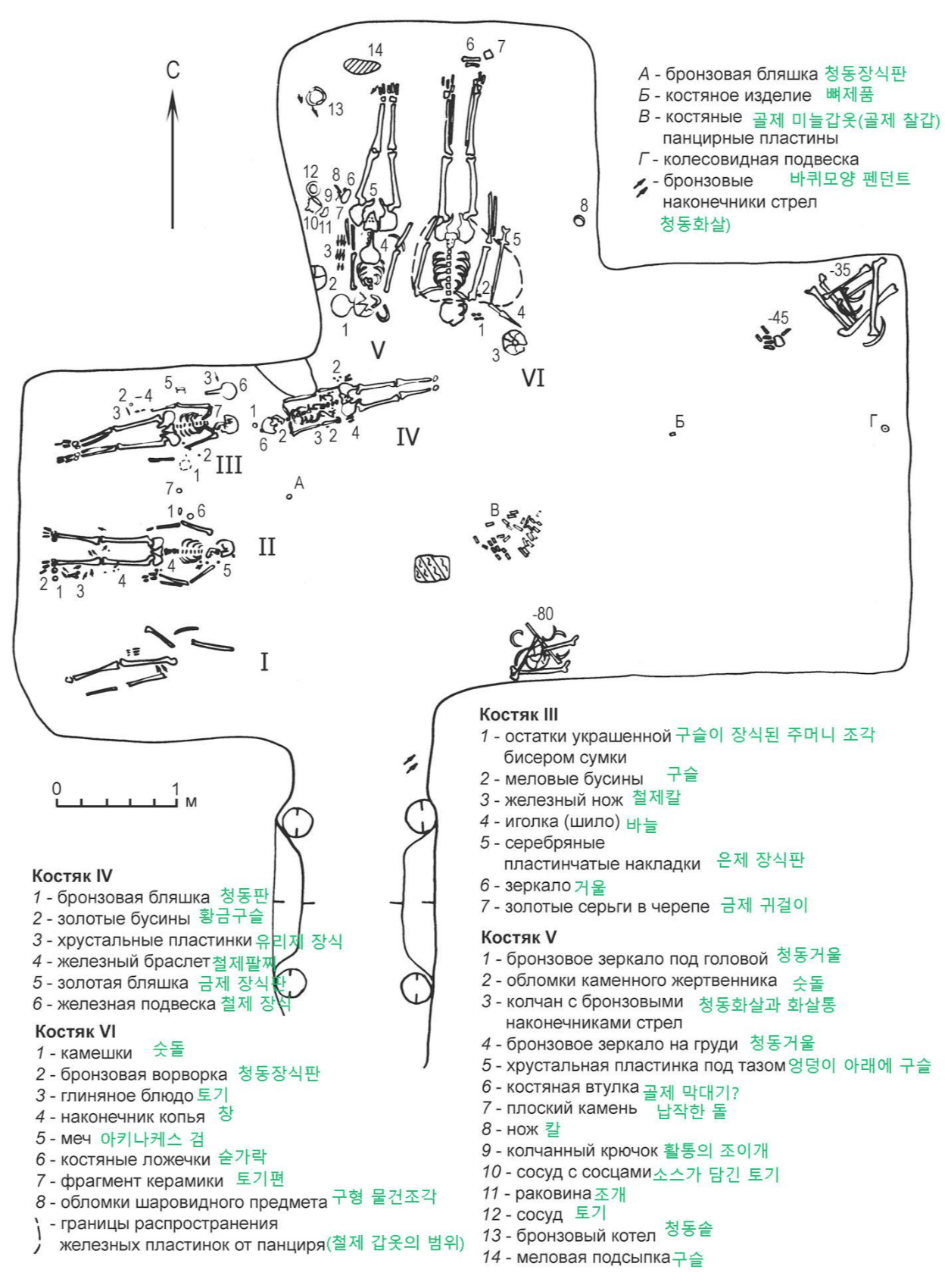 그 중에서 6번 인골은 맹수장식이 그려진 뼈로 된 숟가락(그림 3-5)을 가지고 있었다. 동물 뿔 모양?이 붙은 숟가락 한 점도 함께 부장되었다. 이 사람은 아키나케스 검(그림 2-8)과 철제 창(그림 2-1)을 가지고 있었다. 인골 상반신을 철제 미늘갑옷(찰갑)(그림 2-9)이 덮고 있었으나 상태가 매우 불량했다. 철제 갑옷을 입은채 로 묻혔다고 볼 수 있다. 검과 창을 들고 갑옷 입고 죽은 사람 옆에 놓인 숟가락 2점과 토기....의례행위라면 가능도 할 수도 있겠다.