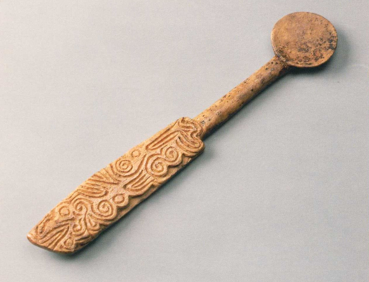 뼈로 된 숟가락(그림 3-5)라고 하지만 실제 사진(그림 4)은 앞 부분이 편평해서 숟가락이 아닐 수도 있다. 유적 전체에서 이와 같은 유물은 1점 출토되어서 다른 유물과의 비교가 힘들다. 숟가락은 스키타이 문화에서 일반적으로 발견되는 유물은 아니다. 그래서 이 유물이 숟가락이 아니라 일종의 부적?과 같을 수도 있다. 어찌되었던 동물문양 중에 맹수머리 혹은 그리핀 장식이 있었다는 점이 더 중요하다.