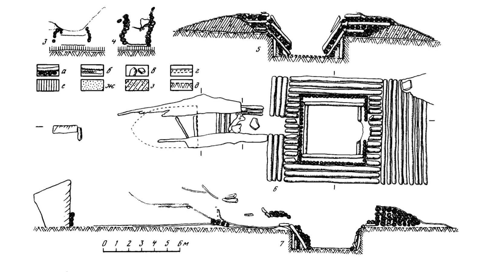 그림 3. 볼쇼이 살브이크 쿠르간의 내부 평면도(6)와 단면도(3,4,5, 7). 3,4,5는 남북방향의 단면도, 7은 동서방향의 단면도 , 평면도(6)에서 왼쪽이 동쪽입구이다.