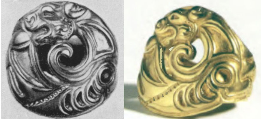그런데 동물이 표현된 반지 가운데 실드부분(직경 3.6cm)은 대부분 음각으로 표현되지만 양각으로 표현된 유물이 1점 있는데 앞에서 설명한 반지에 비해서 매우 크다. 몸을 말고 있는 맹수장식으로 날개가 달려 있다. 스키타이 황금 유물을 제작한 방법으로 제작되었다고 앞서 포스팅했다. 이 유물 역시 일종의 도장 역할을 했을 것으로 생각된다(그림 3).