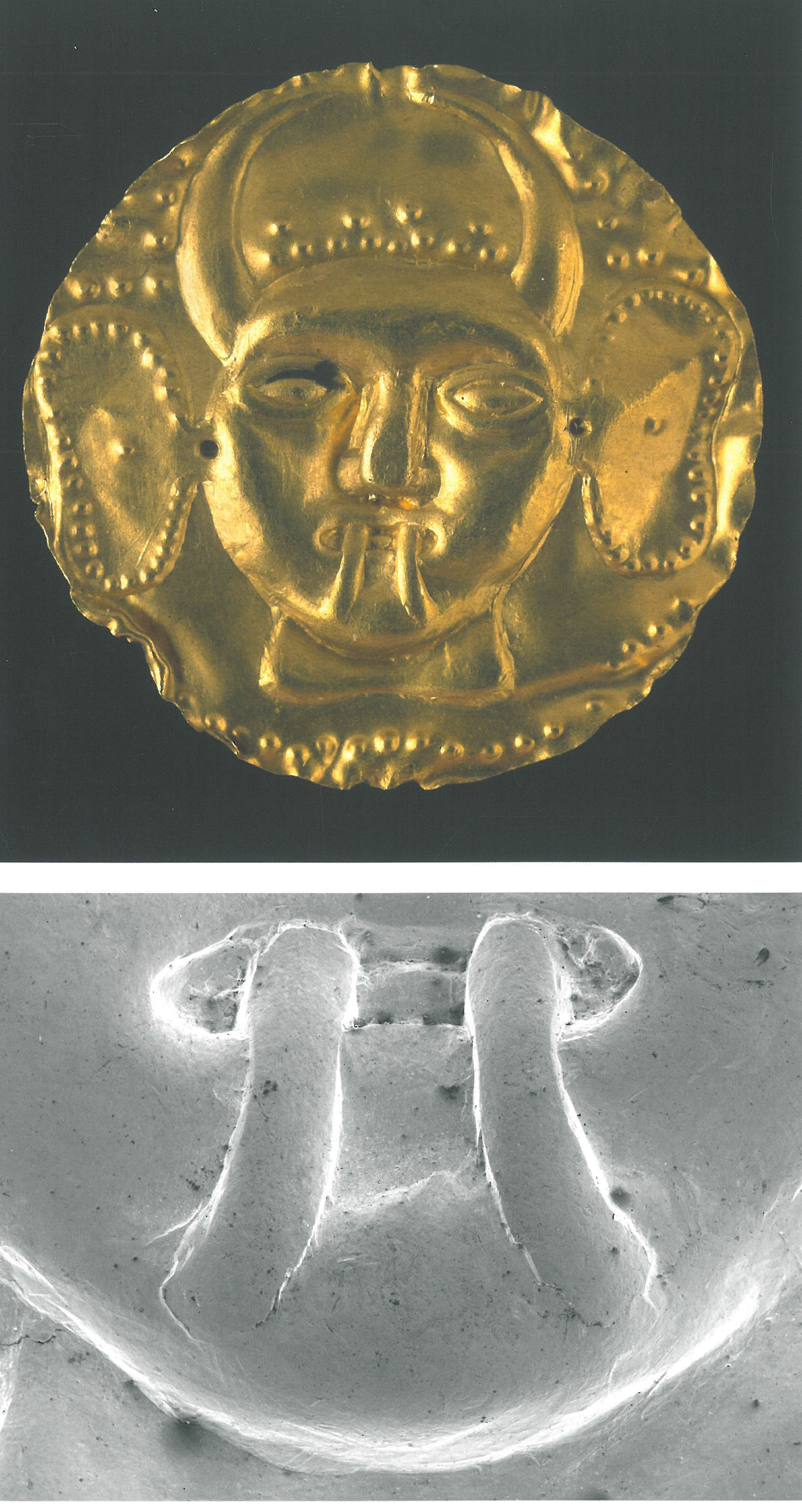 사자얼굴(그림 2)이 남아 있는 원판유물은 앞서 소개한 바 있는 스키타이 황금 제작 기술인 chasing, punching, repousse이 모두 확인된다. 사자라고 알 수 있는 것은 갈기가 있기 때문인데, 갈기의 윗부분과 작은 뿔, 귀가 있다. 테두리에는 대각선으로 눈김이 새겨져 있다. 그림 2 하단의 사진에서 눈과 눈썹 등 사이에서 체이싱 기법이 그대로 잘 보인다.