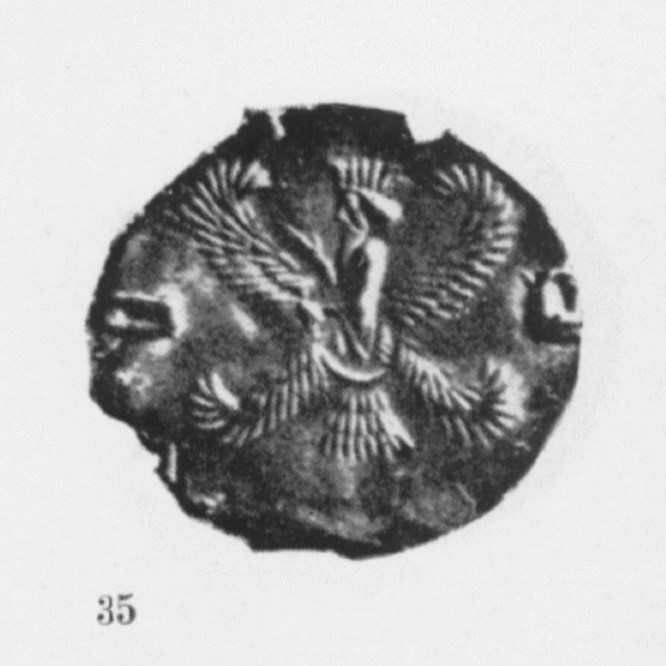 몸은 독수리이며, 얼굴은 인간이 표현된 원판형 장식물도 발견되었다. 수염기른 남성으로 머리에는 아케메니드 왕조의 궁전벽화에서 확인되는 티아라를 쓰고 있다. 달턴은 조로아스터교의 신인 아후라 마즈다Ahura mazda로 해석했다.