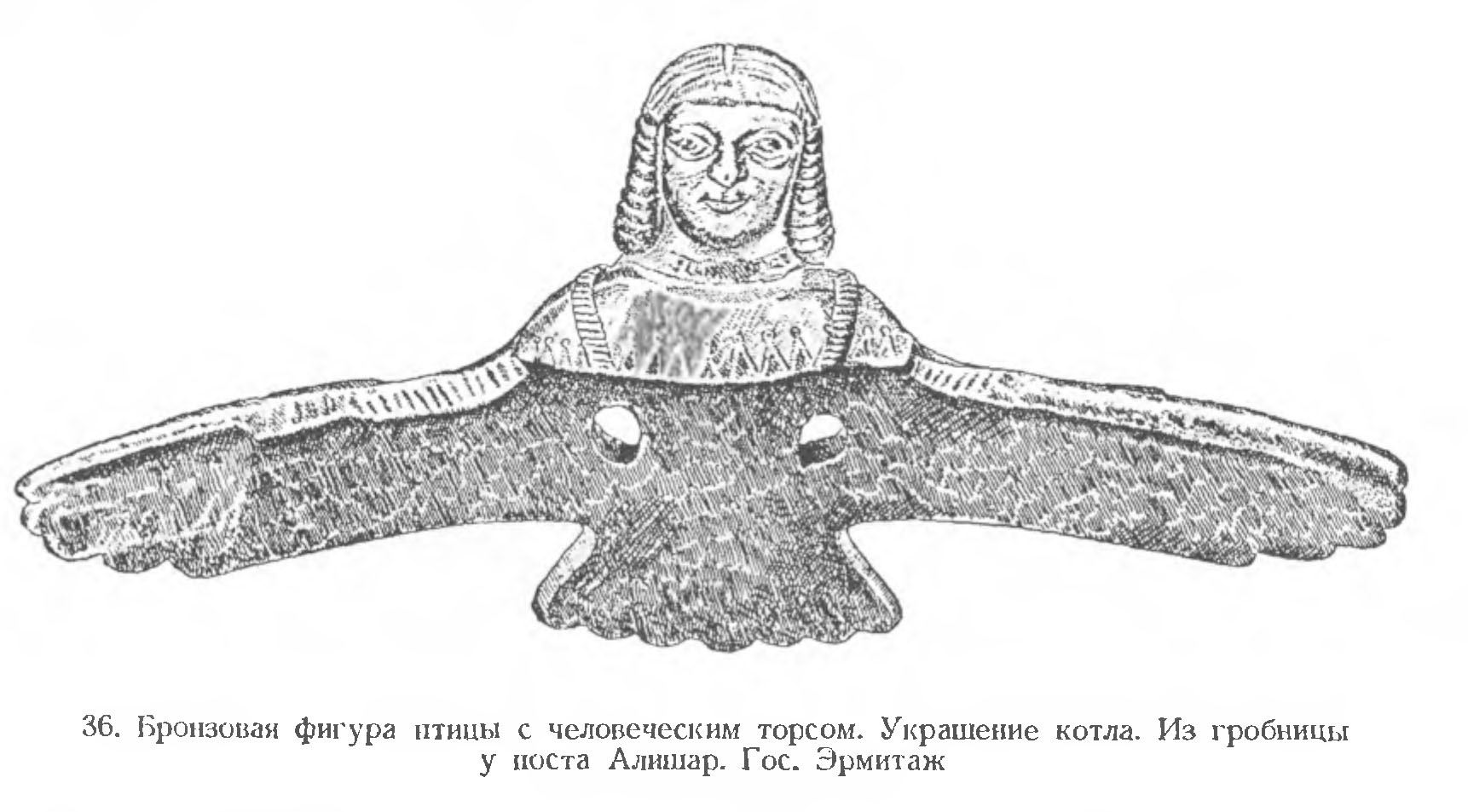 청동솥에 달았던 흔적이 남아 있는 날개를 편 새의 모습에 인간 얼굴이 달려 있는 유물도 발견되었다. 알리샤르 유적의 무덤에서 출토된 것이다.
