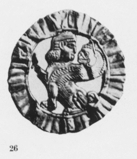 그런데 아직 알려드리지 않은 유물 가운데 우리가 알고 있는 스핑크스처럼 생긴 반인반수가 원판형 속에 들어가 있는 것도 있다. 앉아 있는 스핑크스로 오른쪽 앞발을 올리고 있고, 반구형의 모자를 쓰고 있고 이마 경계에는 진주?알 문양의 목걸이가 돌아간다. 모자 아래에는 머리카락을 뒤로 모은 스타일이다. 날개의 윤곽을 따라서는 깃털을 표현했고 그 끝에는 맹수가 달려 있다. 이 유물은 옷의 장신구(직경 5cm, 직경 4.2cm)이다.
